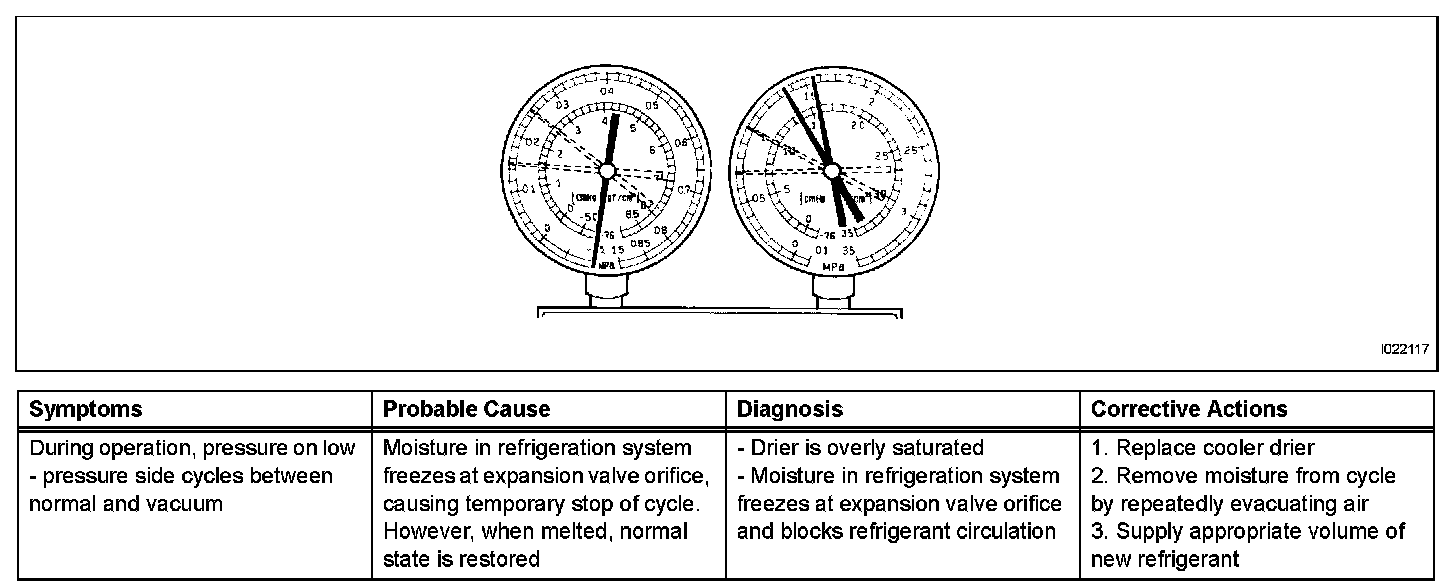 2. The A/C system periodically changes between normal and improper function due to moisture in the refrigerant system.