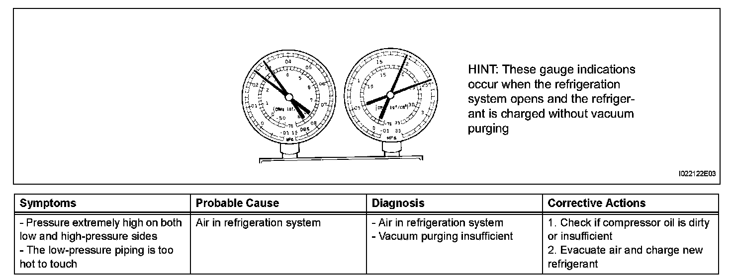 7. The A/C system does not function due to air in the refrigeration system.