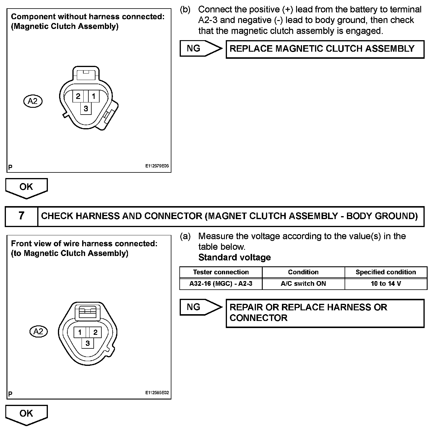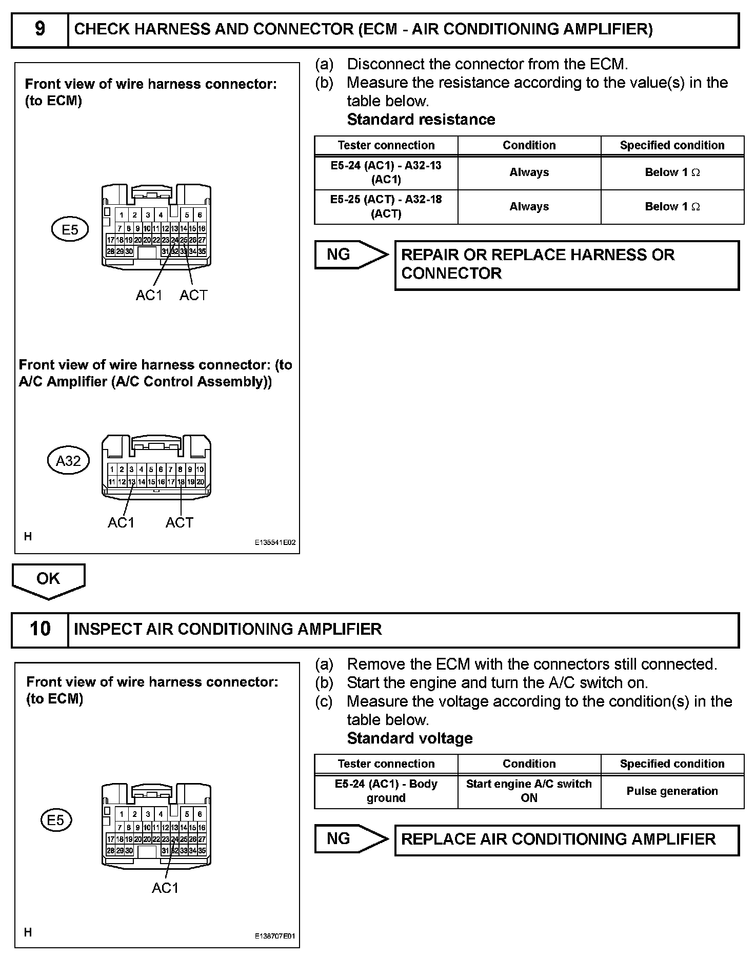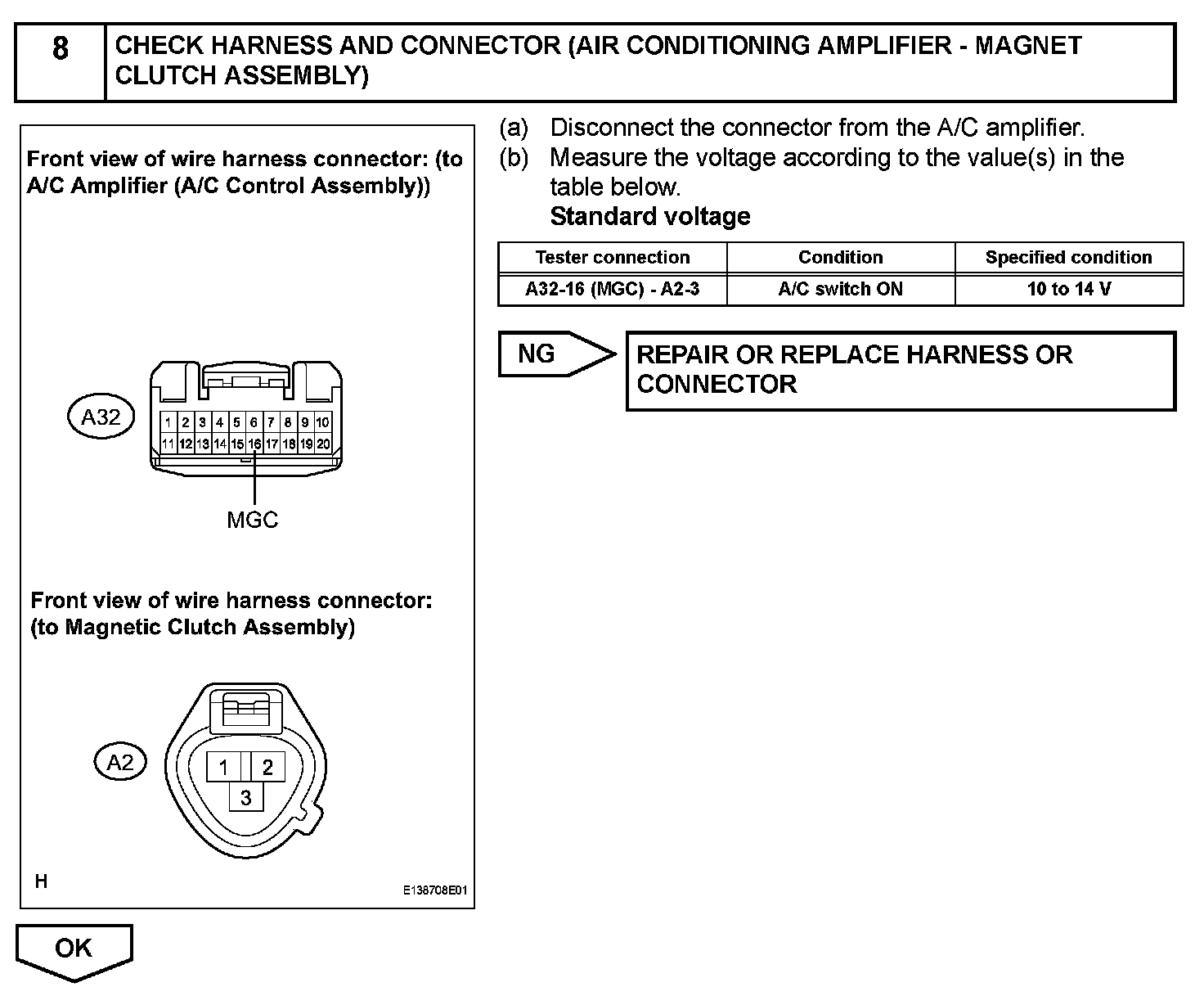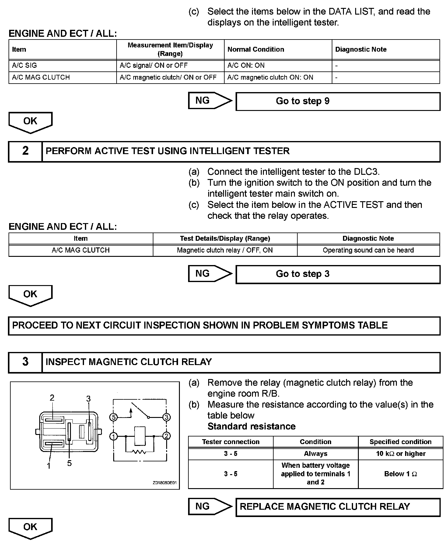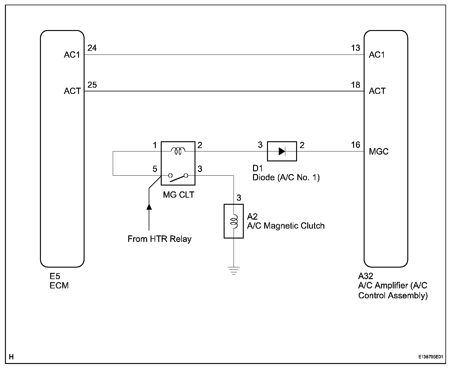 The A/C amplifier outputs the magnetic clutch ON signal from terminal AC1 to the ECM receives this signal, it sends a signal from terminal ACMG (MGC) and switches the magnetic clutch relay ON, thus turning on the magnetic clutch.