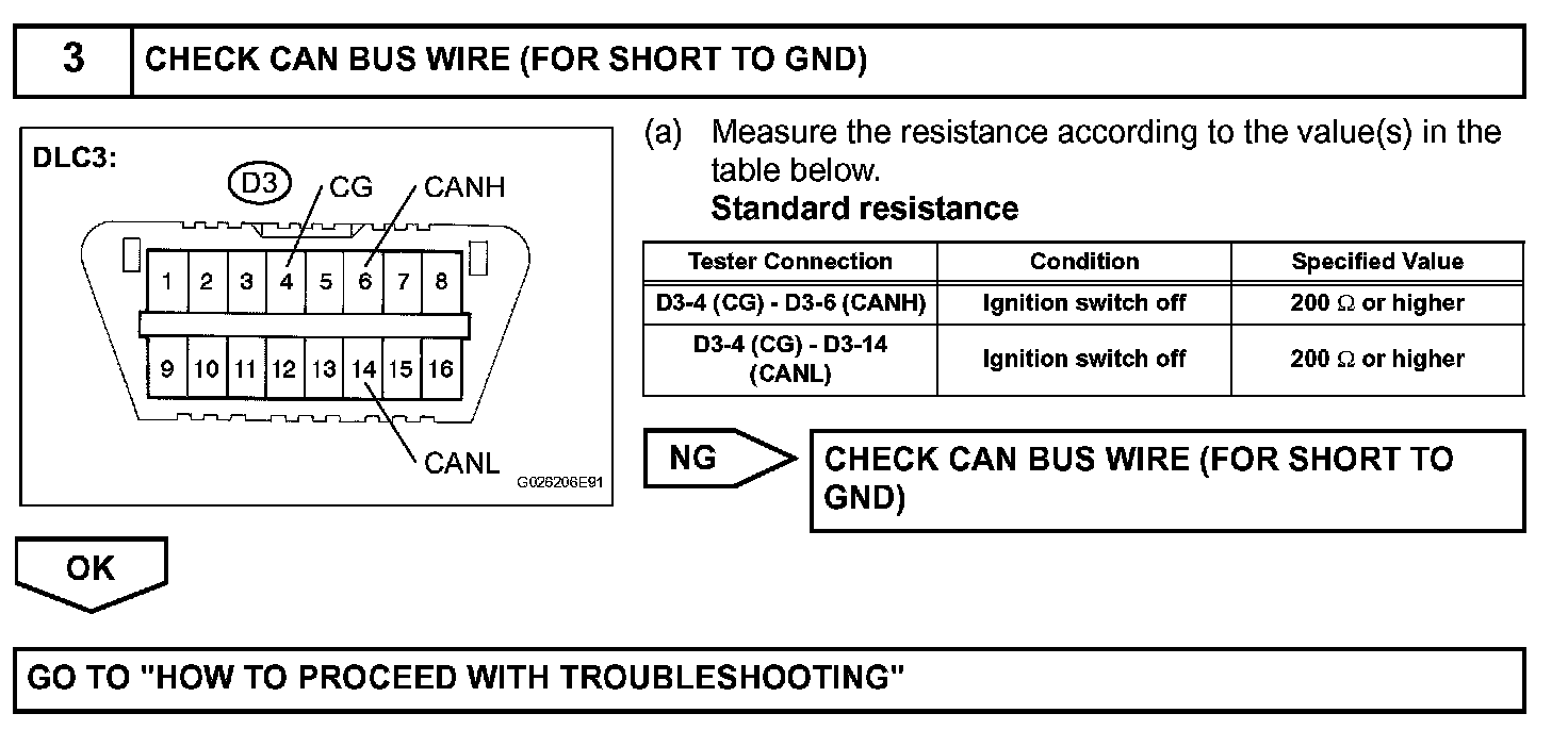 When any DTC for the CAN communication is output, first measure the resistance between the terminals of the DLC3 to specify the trouble area.