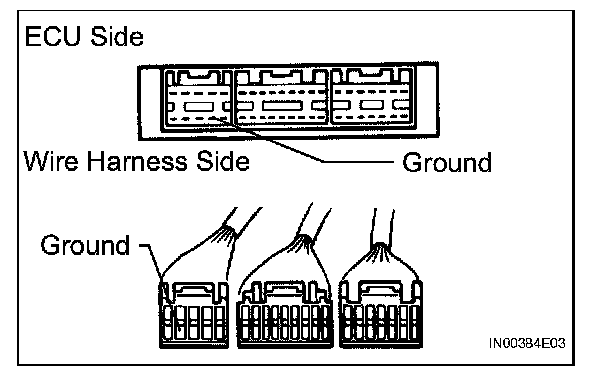 2. Disconnect the ECU connector. Check the ground terminals on the ECU side and wire harness side for bending, corrosion or foreign matter. Lastly, check the contact pressure of the female terminals.
