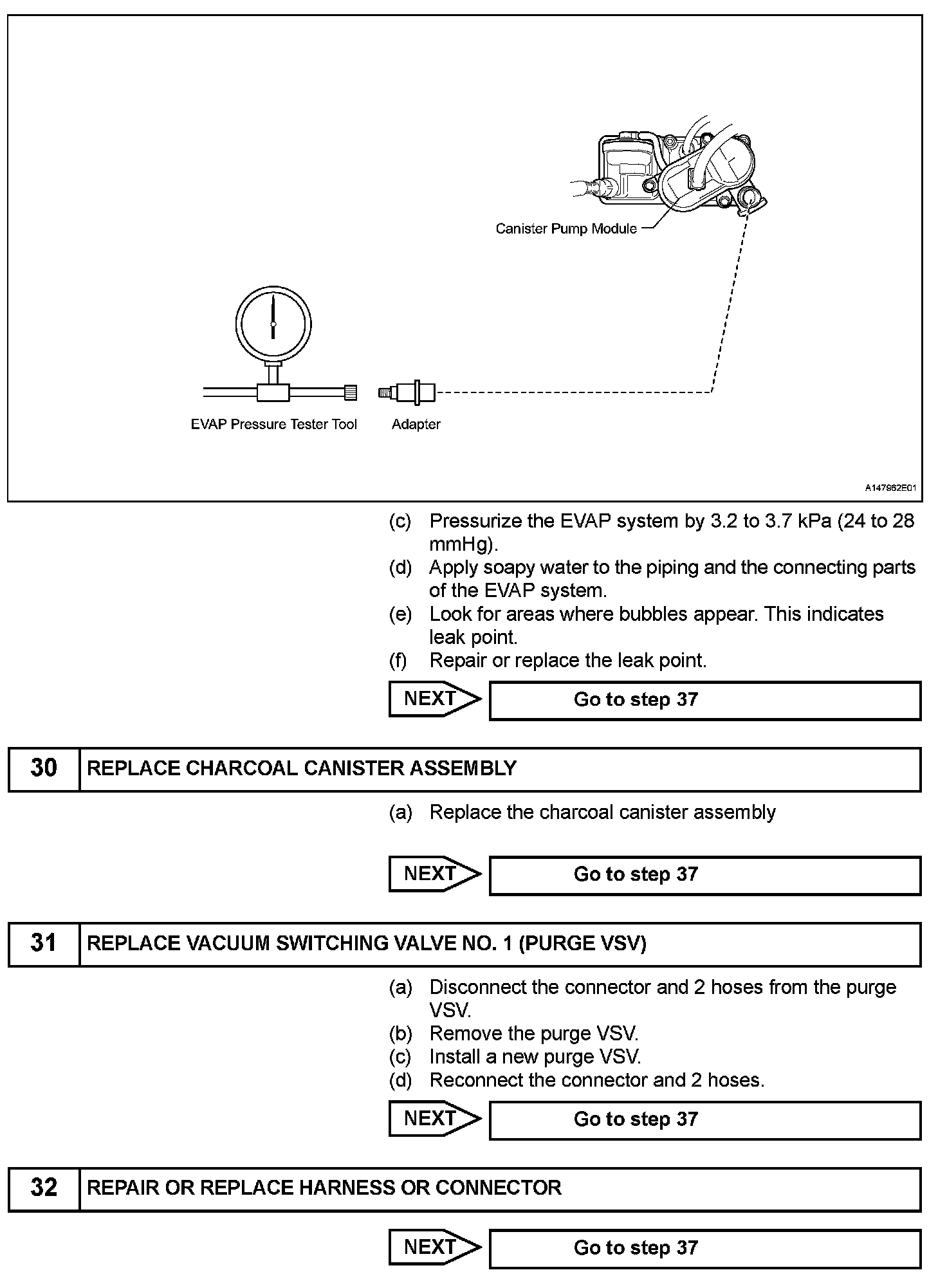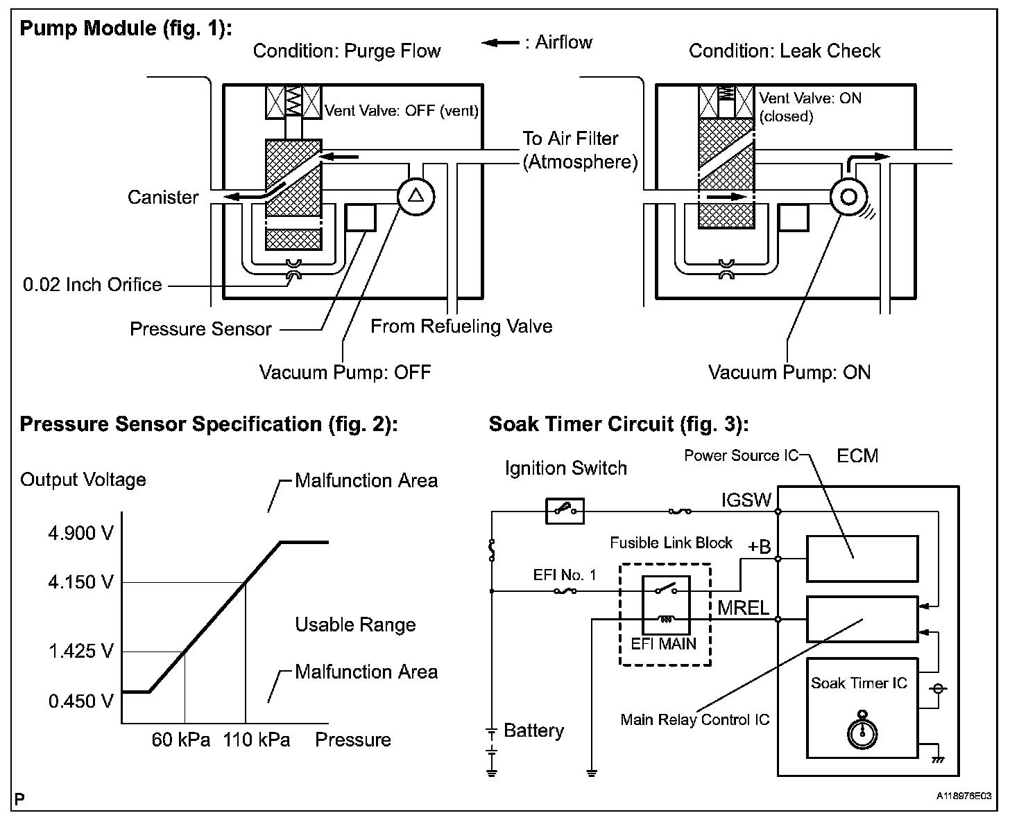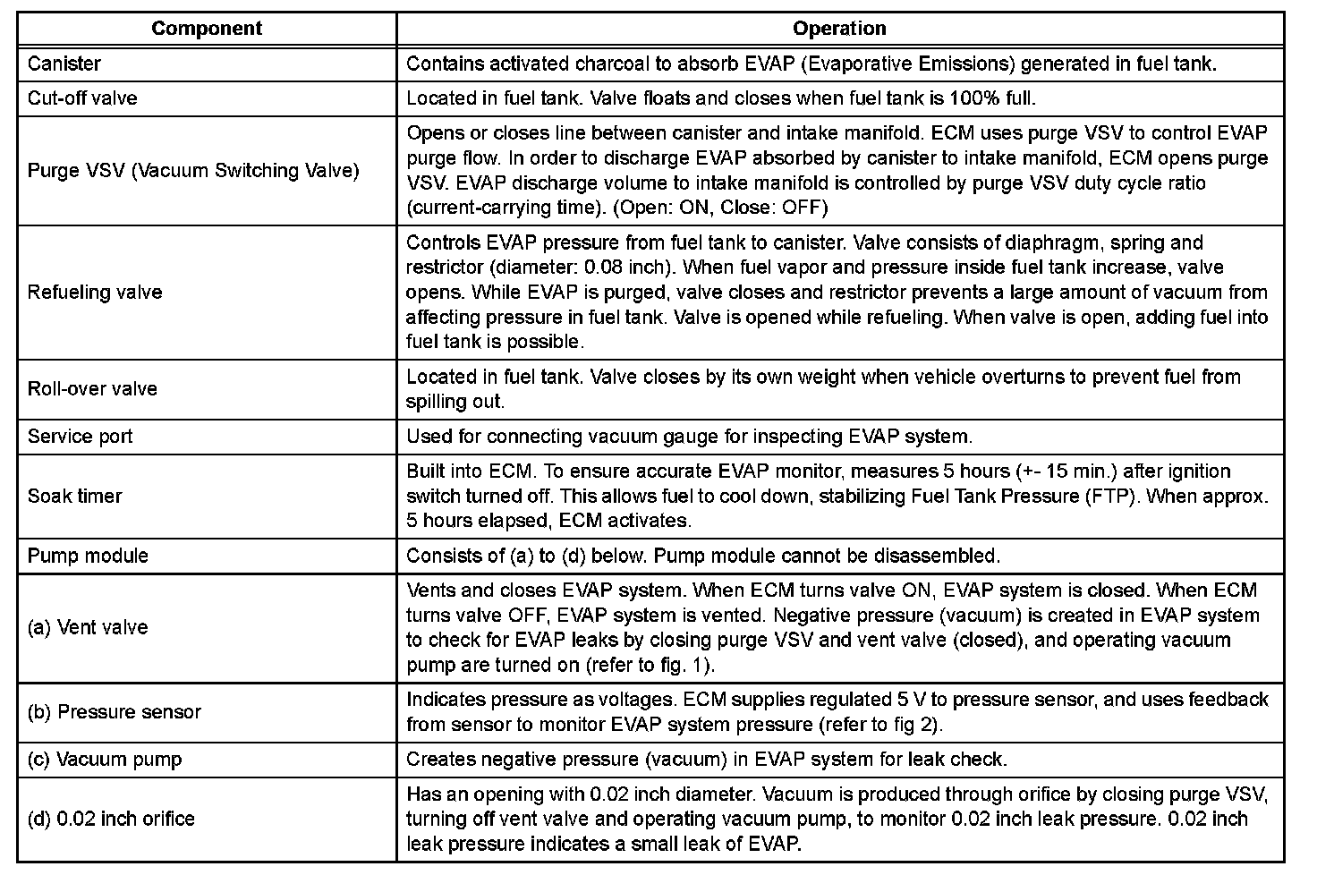 The electric vacuum pump creates negative pressure (vacuum) in the EVAP system, and the pressure is measured. Finally, the ECM monitors for leaks from the EVAP system and malfunctions in both the pump module and purge VSV, based on the EVAP pressure.
