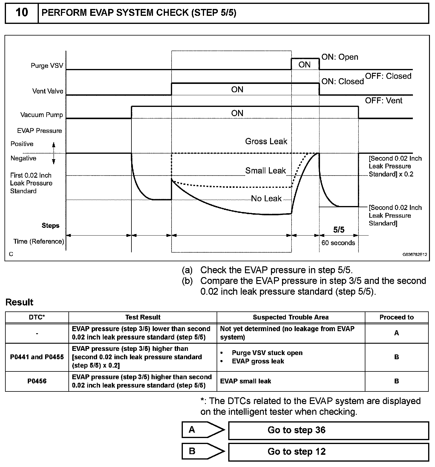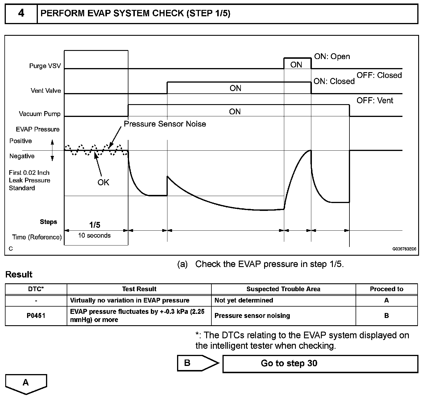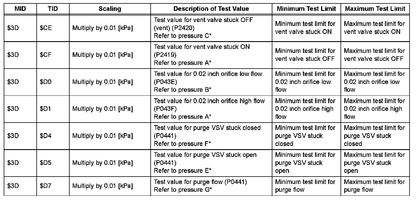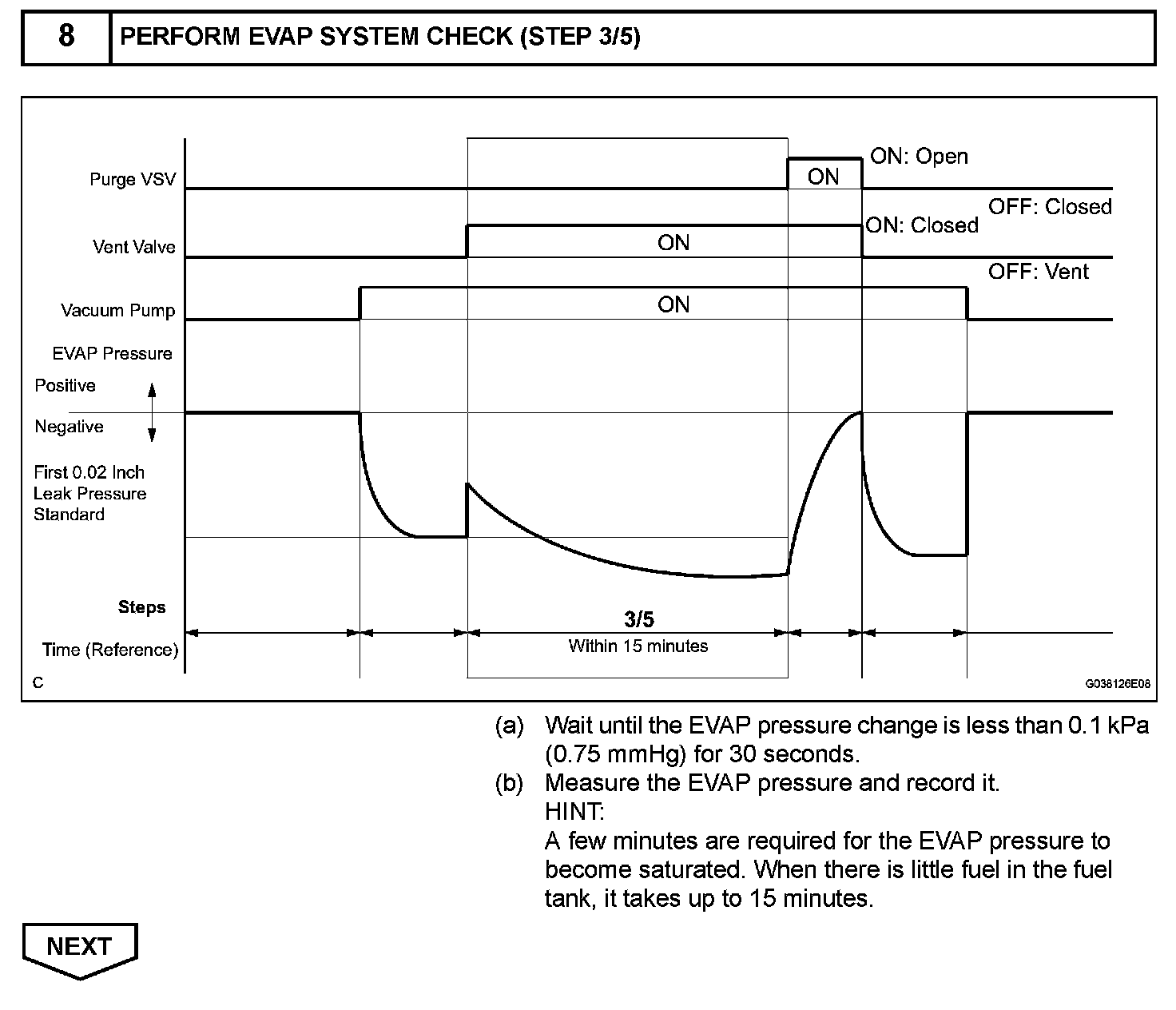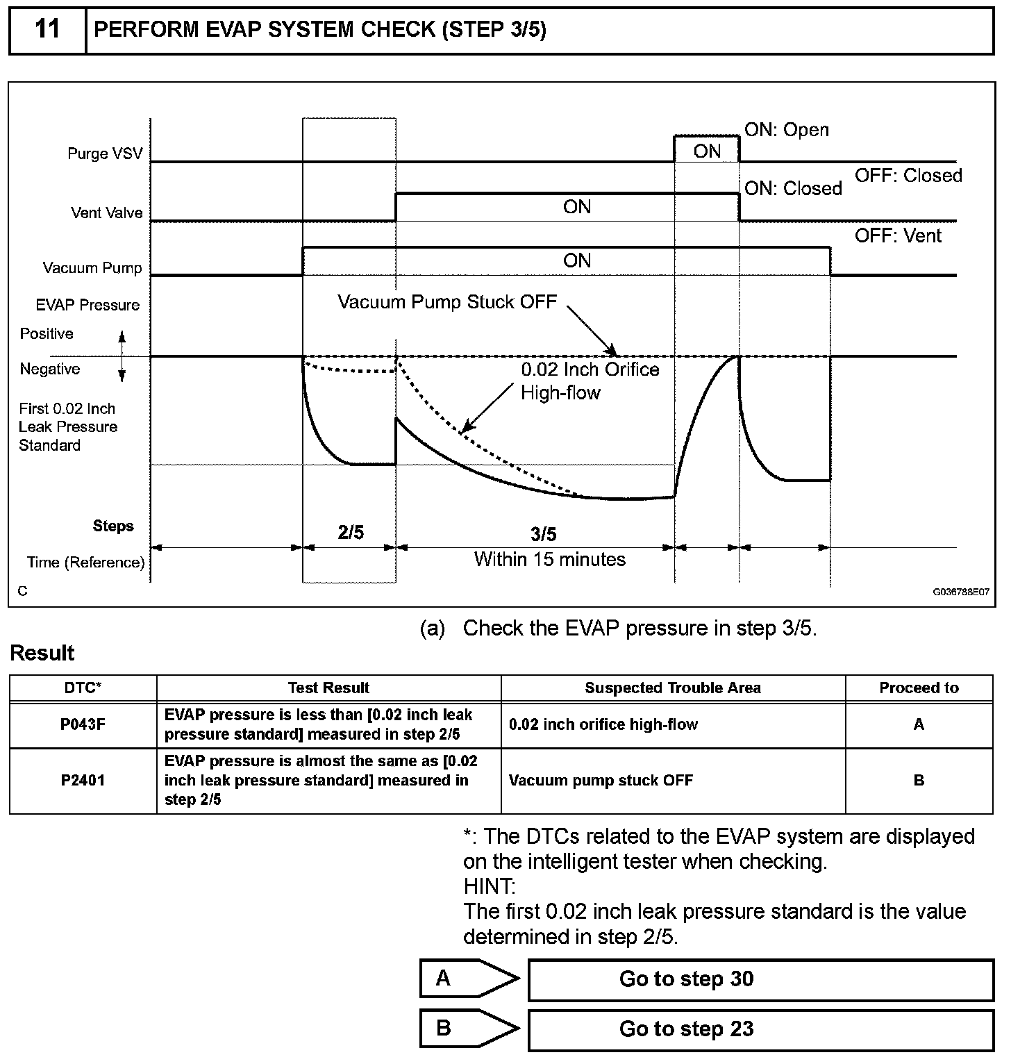 NOTE: If the 0.02 inch reference pressure difference between the first and second checks is greater than the specification, the DTCs corresponding to the reference pressure (P043E, P043F, P0441, P0455, P0456, P2401, P2420) will be all stored.