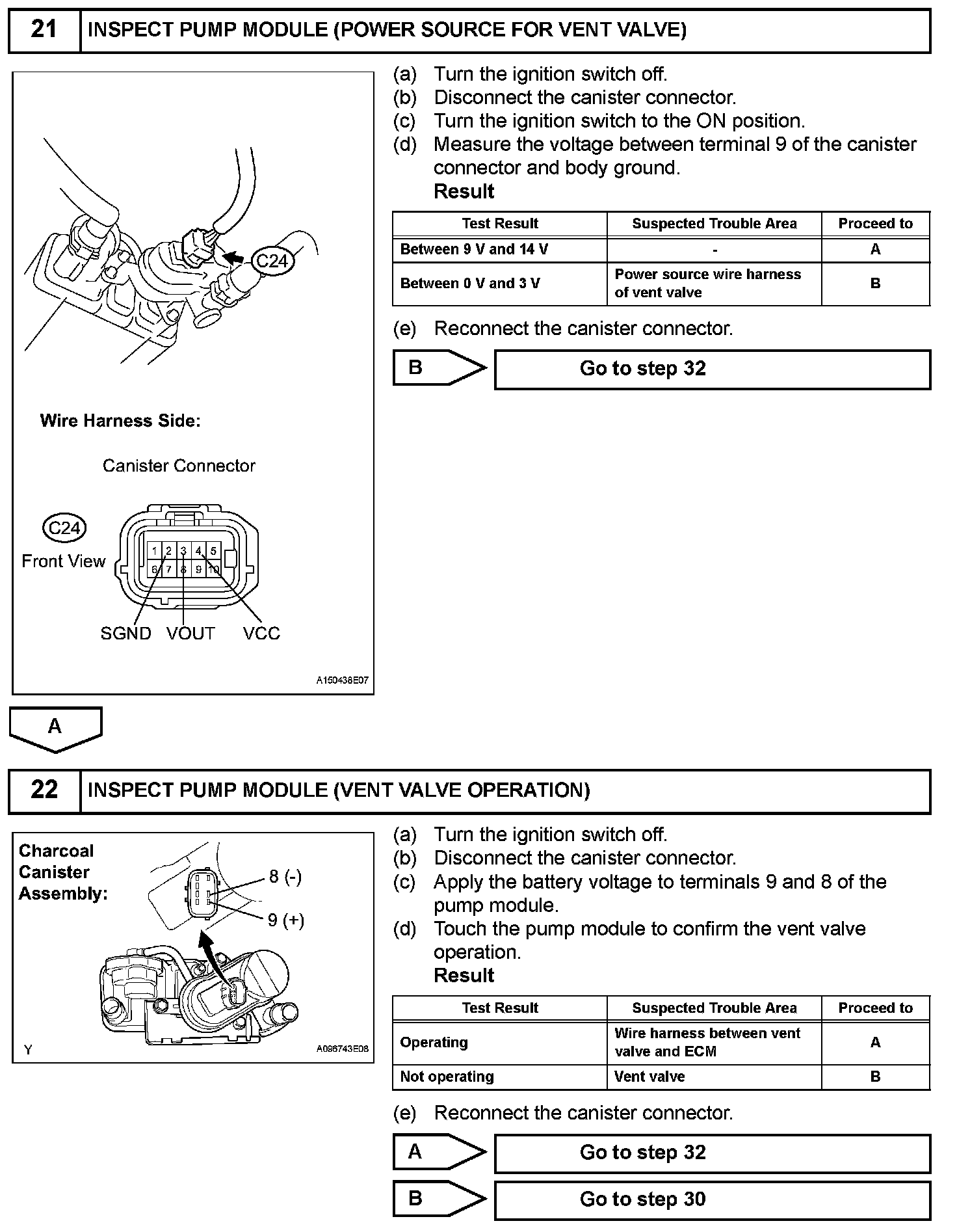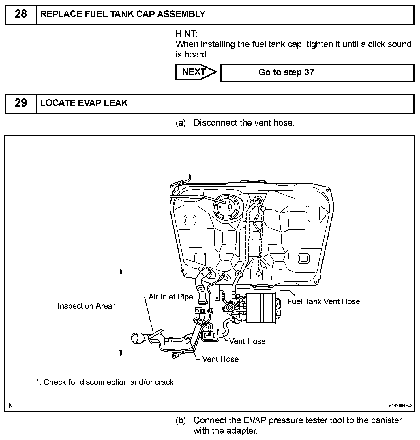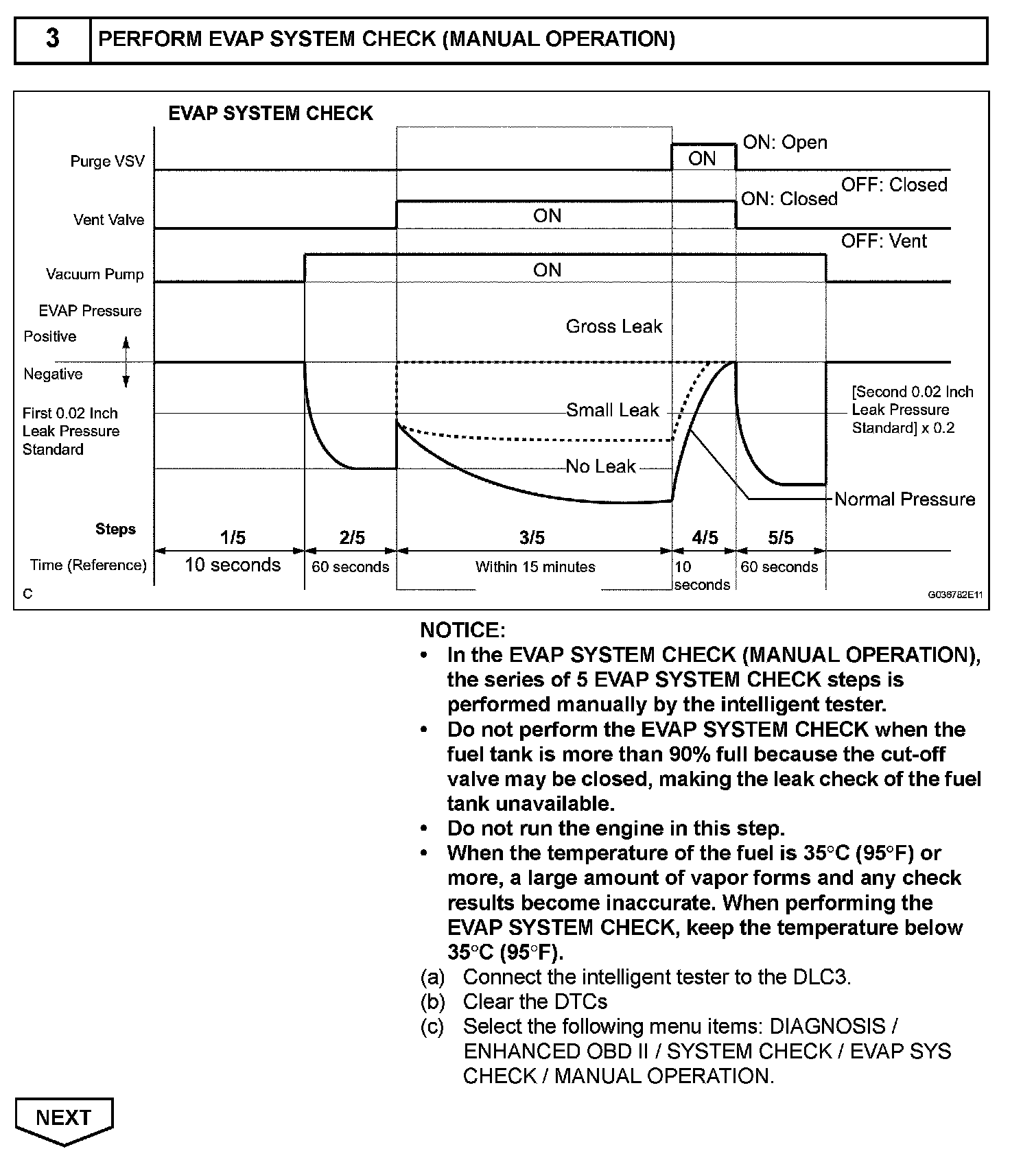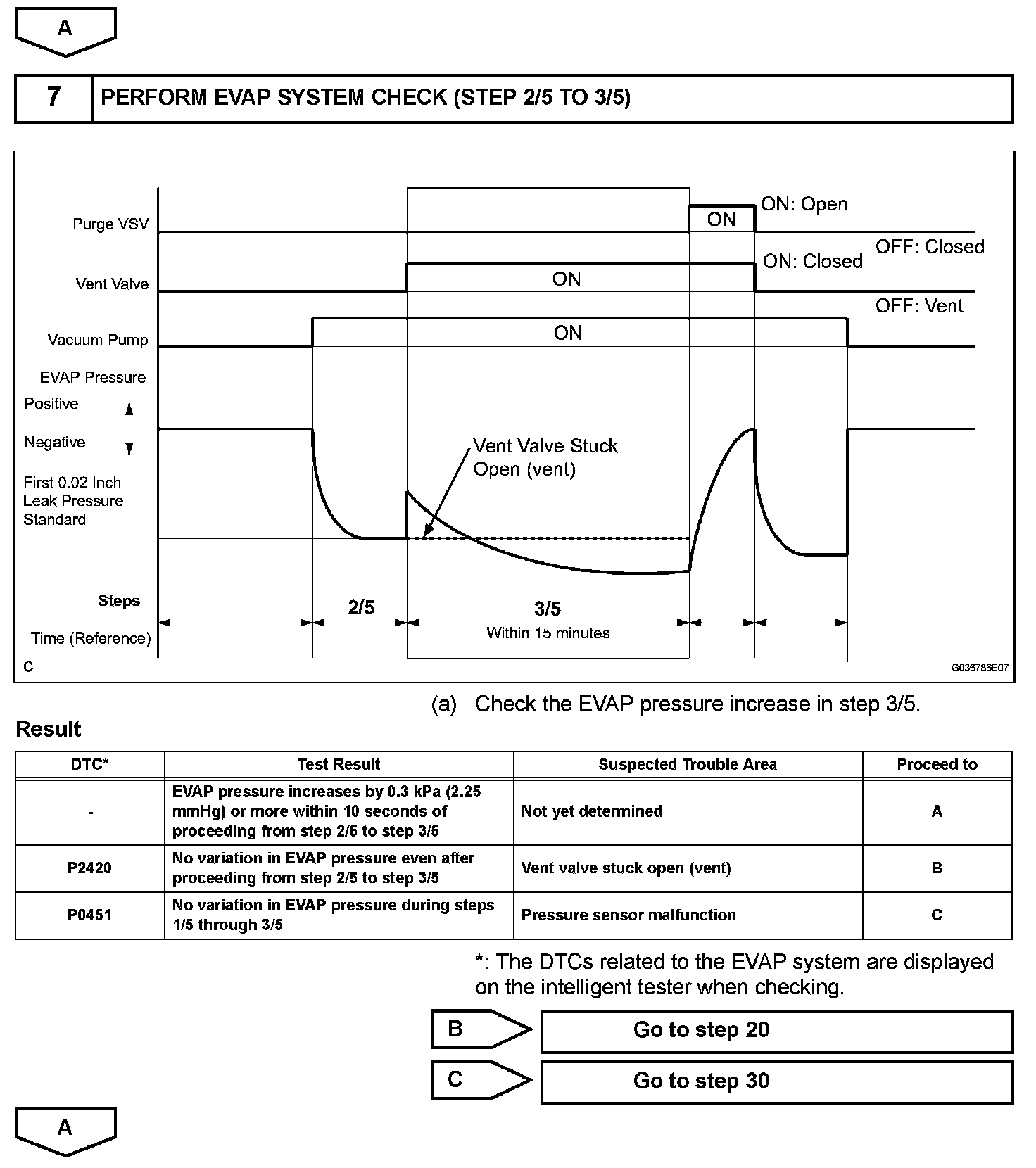 NOTE: If the 0.02 inch reference pressure difference between the first and second checks is greater than the specification, the DTCs corresponding to the reference pressure (P043E, P043F, P0441, P0455, P0456, P2401, P2420) will be all stored.