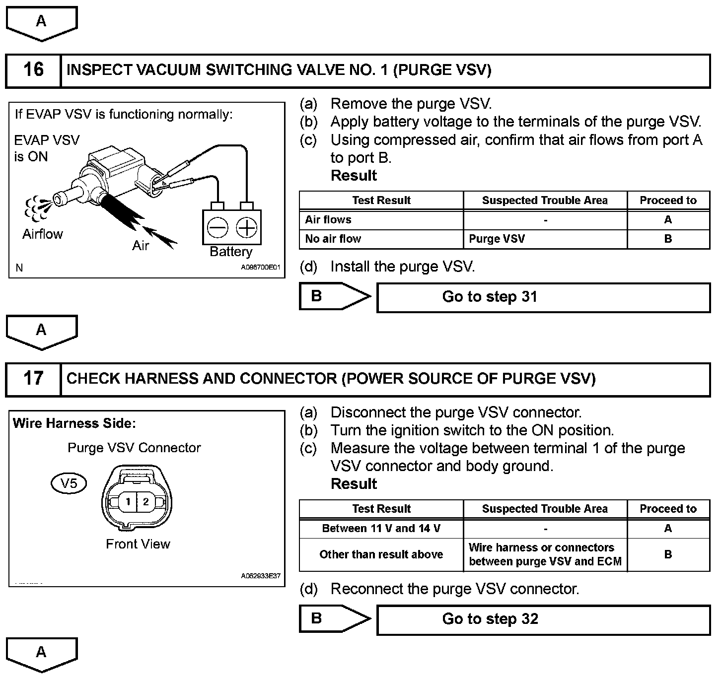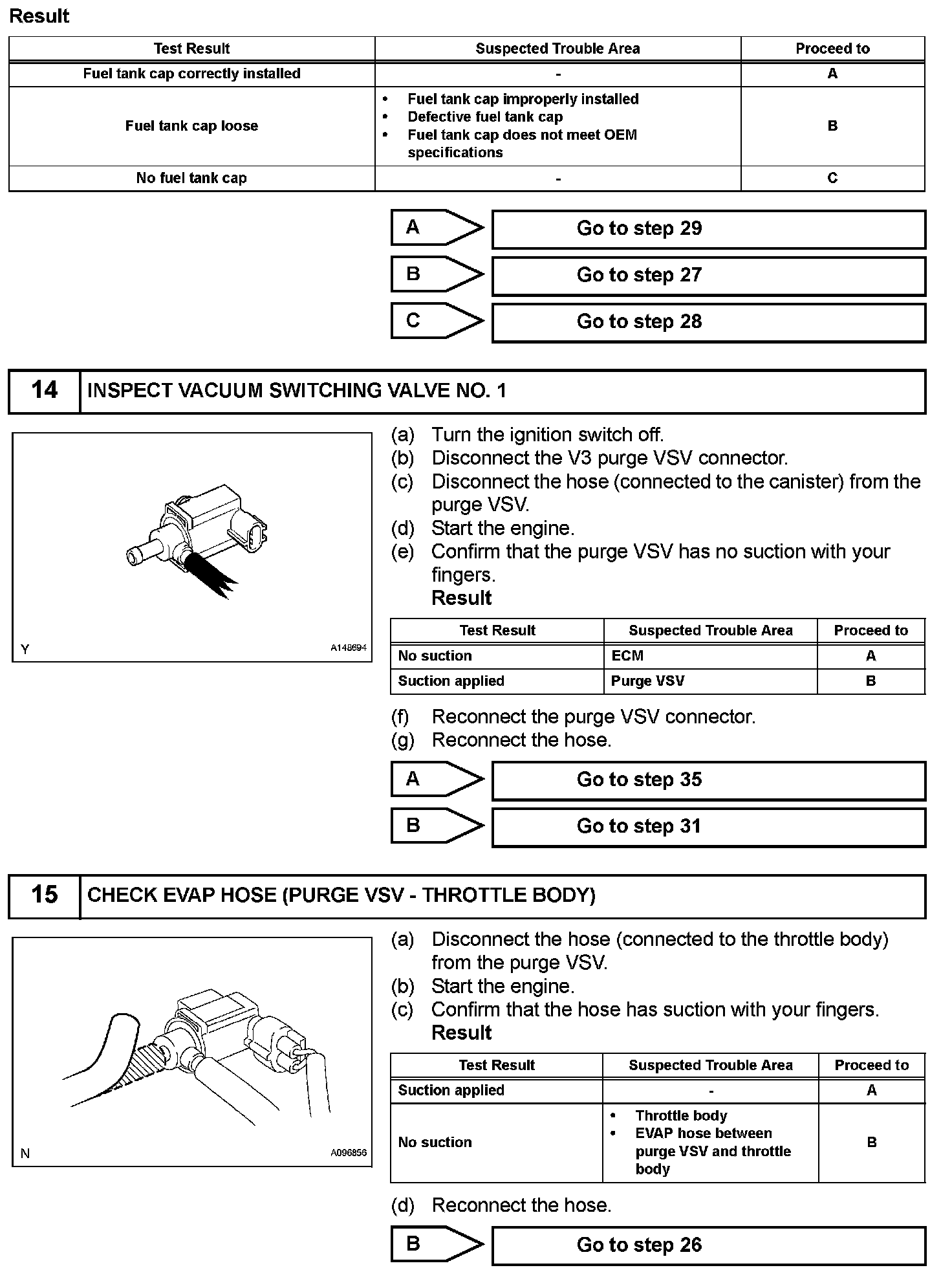While the engine is running, if a predetermined condition (closed-loop, etc.) is met, the purge VSV is opened by the ECM and fuel vapors stored in the canister are purged to the intake manifold. The ECM changes the duty cycle ratio of the purge VSV to control purge flow volume. The purge flow volume is also determined by the intake manifold pressure. Atmospheric pressure is allowed into the canister through the vent valve to ensure that the purge flow is maintained when negative pressure (vacuum) is applied to the canister. The following two monitors run to confirm appropriate EVAP system operation.