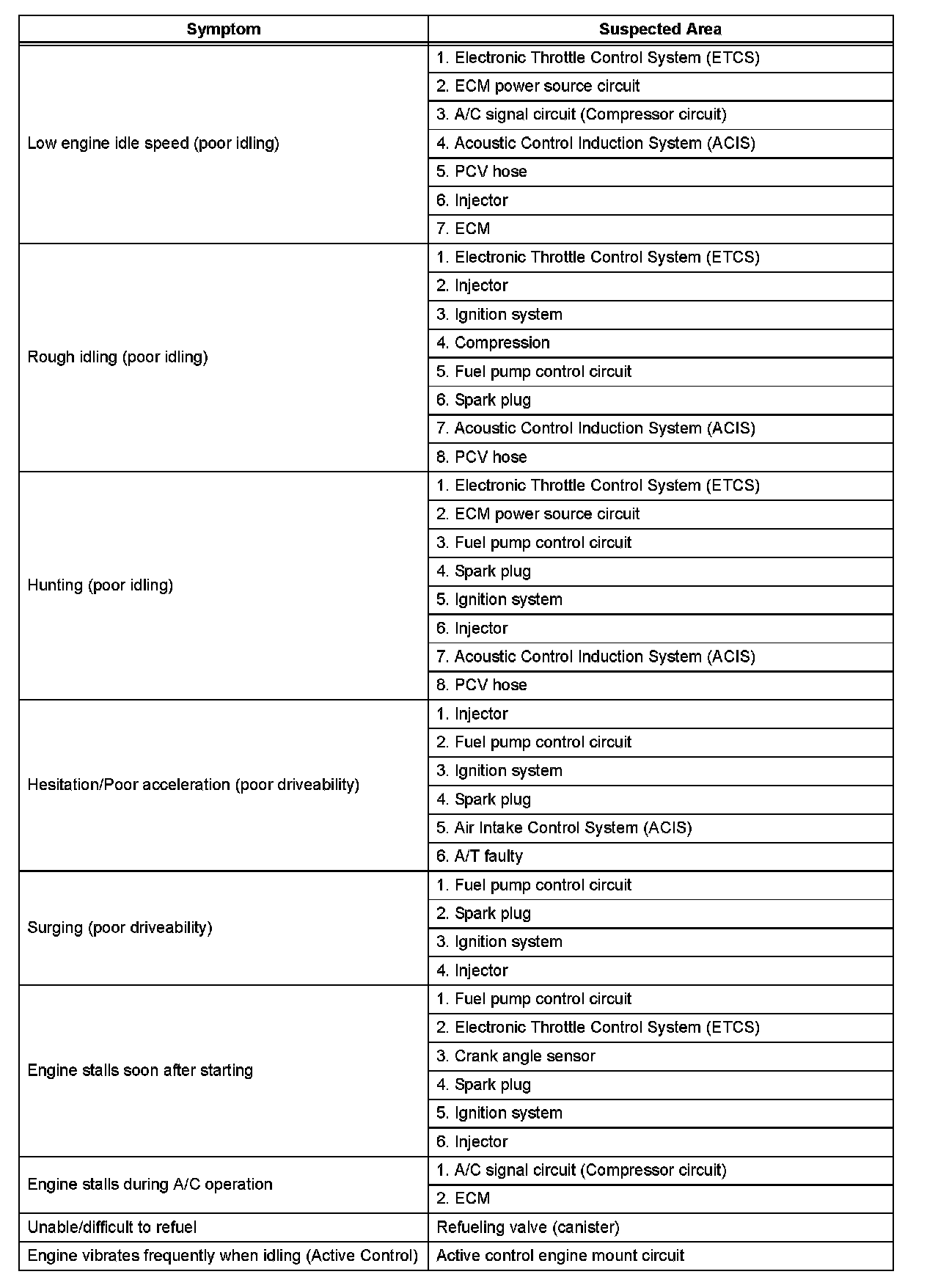 HINT: When a malfunction is not confirmed by a DTC (Diagnostic Trouble Code) check and the cause of problem cannot be identified through a basic inspection, troubleshoot according to the priority order indicated in the table.