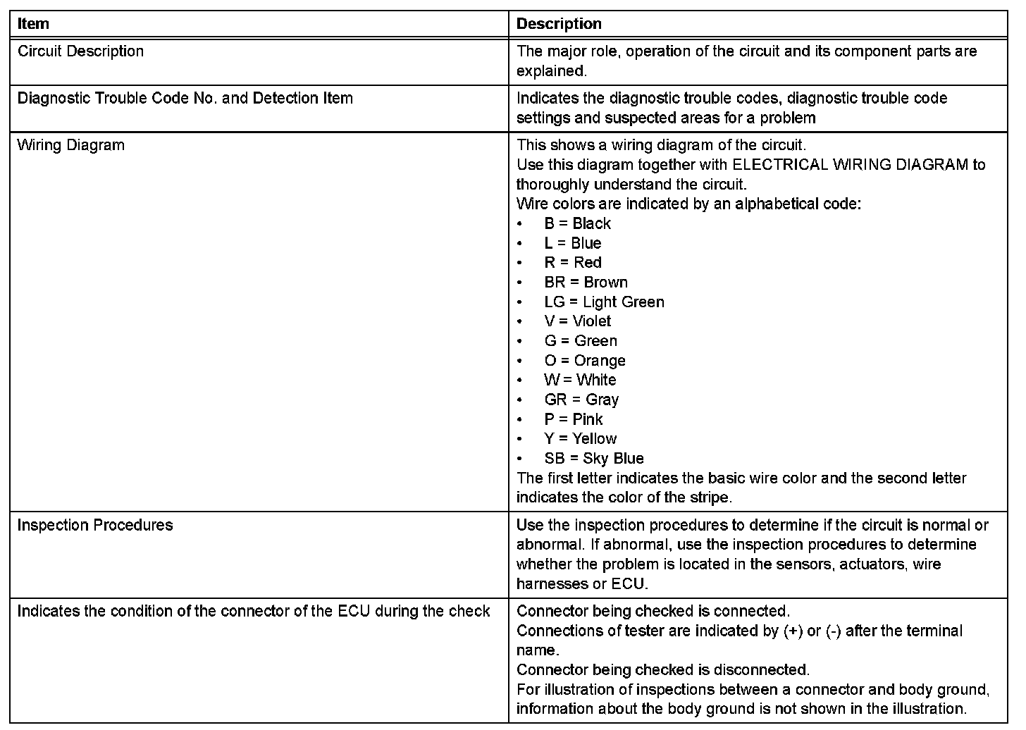 A description of the main areas of each circuit inspection is given.