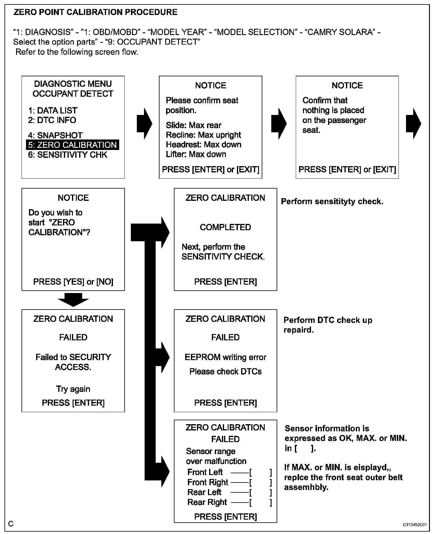 - When zero point calibration has not finished normally, replace the front seat assembly RH.
