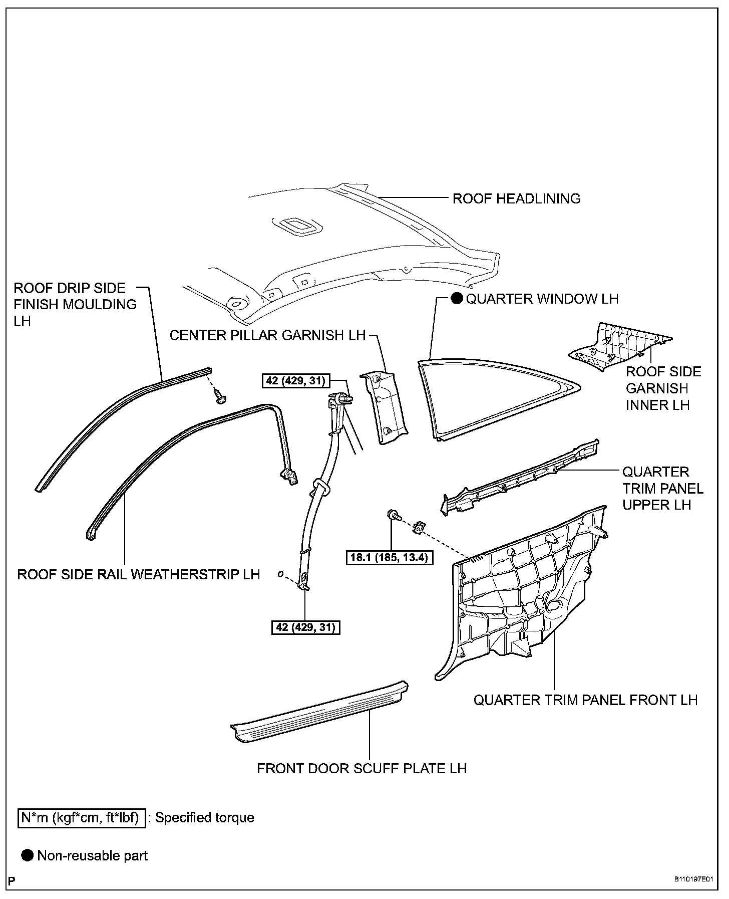 HINT: It is not necessary to completely remove the roof headlining. Slightly lower the rear section of the roof headlining so that the quarter window glass can be removed later in next step.