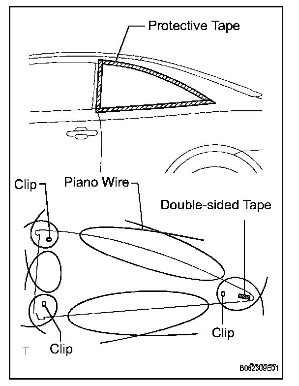 d. From the interior, insert piano wires between the vehicle body and the quarter window glass as shown in the illustration.