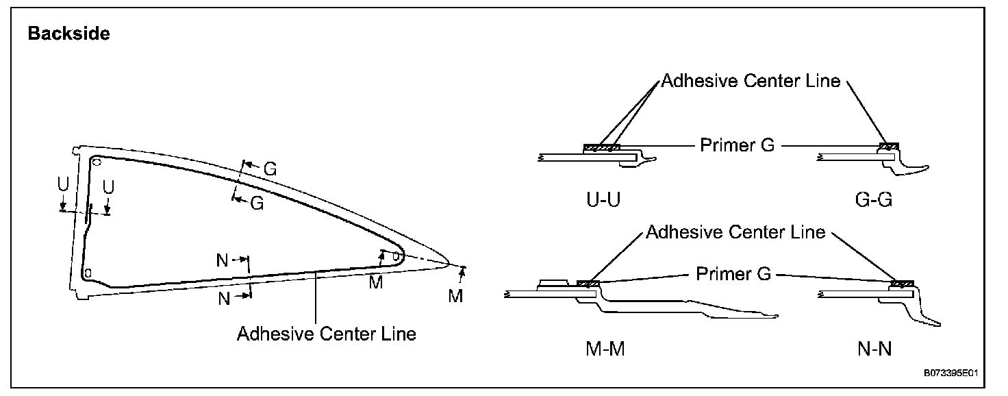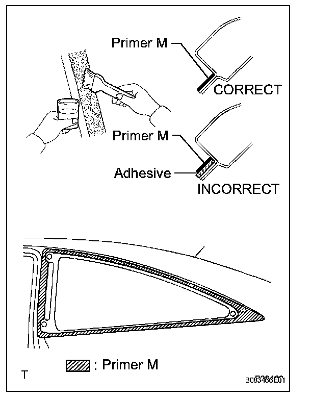 b. Using a brush or sponge, apply Primer G to the contact surface of the quarter window glass.