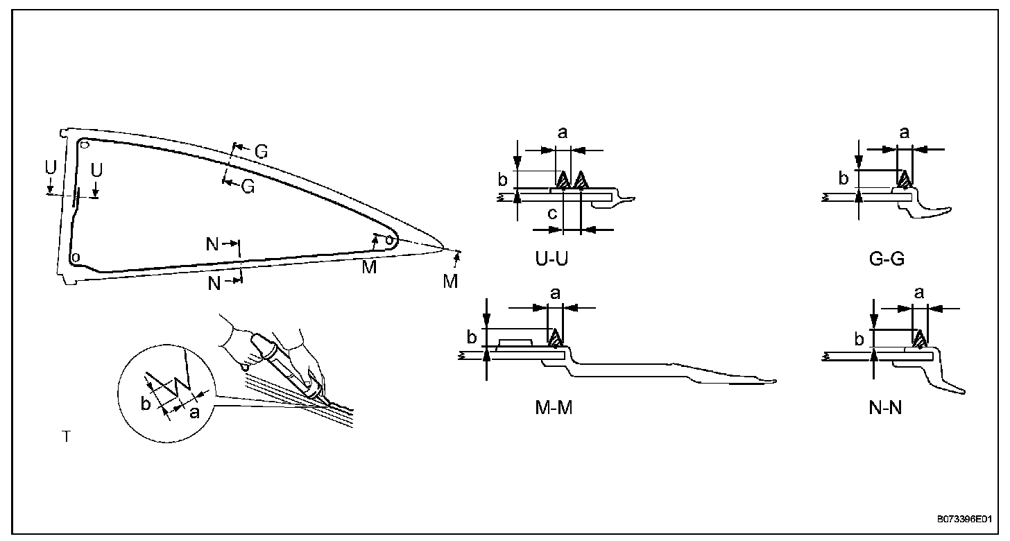 1. Lightly press the front surface of the quarter window glass to ensure that the quarter window glass is securely fit to the vehicle body.