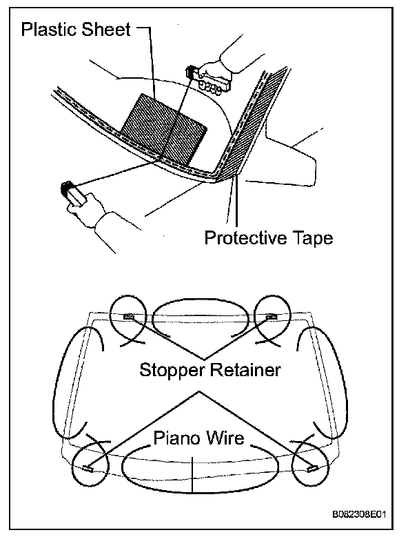 - To prevent the instrument panel from being scratched when removing the windshield glass, place a plastic sheet between the piano wire and instrument panel.