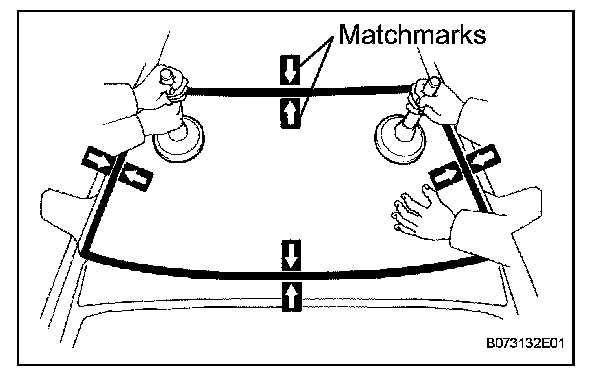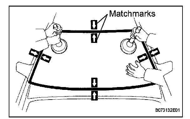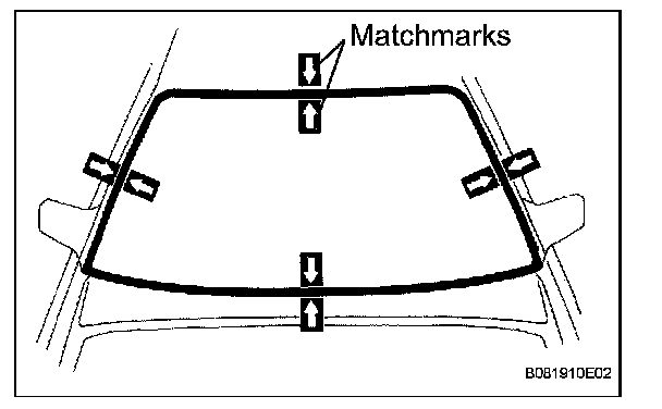 3. Place matchmarks over the windshield glass and vehicle body on the locations indicated in the illustration.
