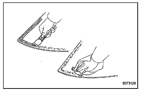 a. Using a scraper, remove the damaged stoppers, retainers, dams and adhesive sticking to the windshield glass.