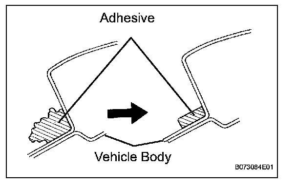 1. On the contact surface of the vehicle body, use a knife to cut away excess adhesive as shown in the illustration.