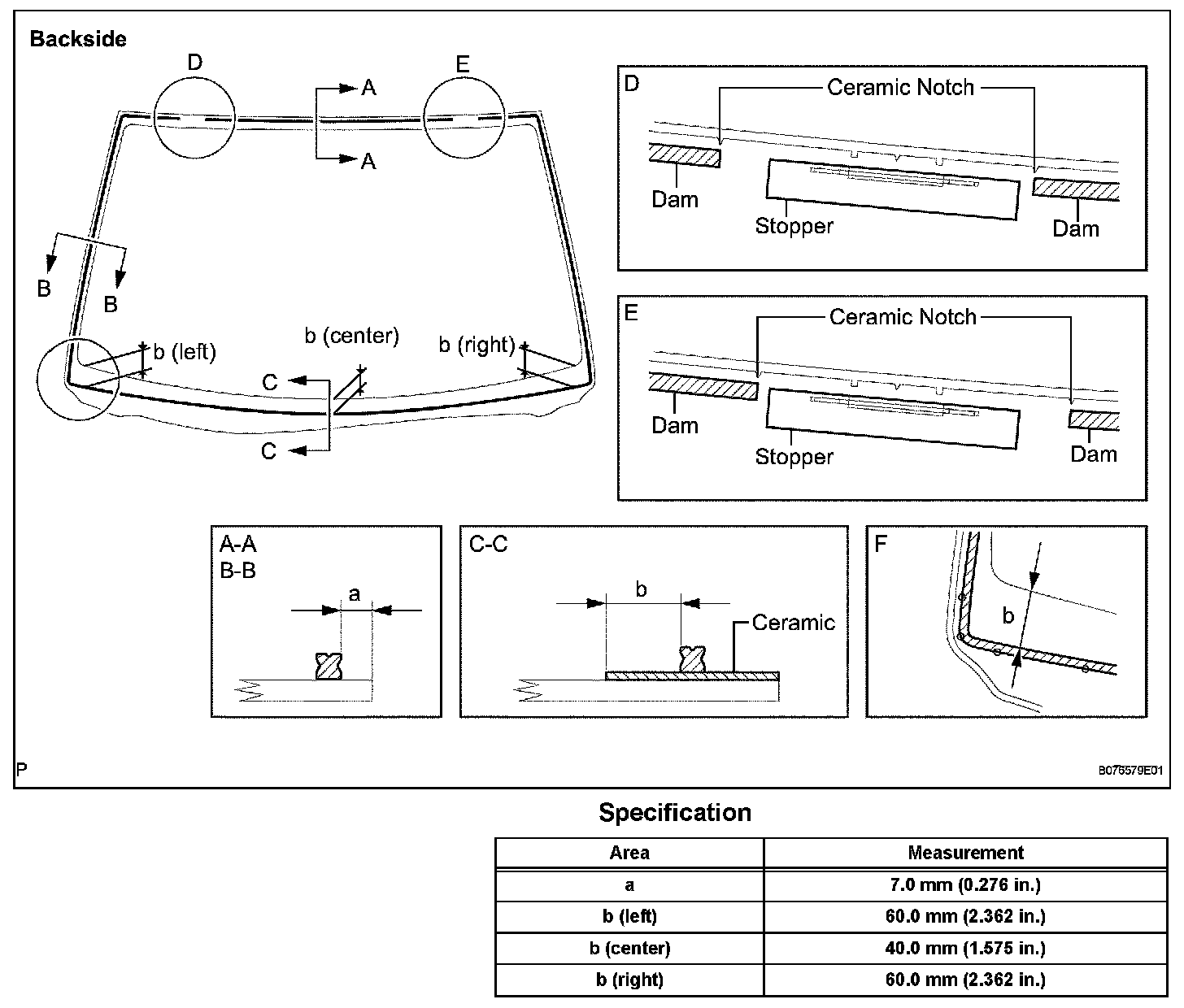 b. Apply double-sided tape along the outer edge of the entire windshield glass except for the area marked D and E in the illustration.