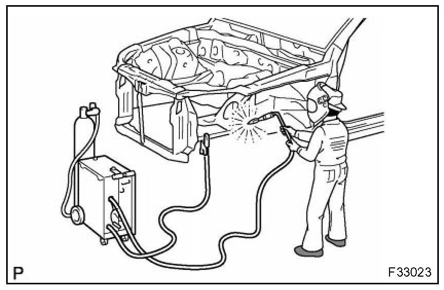 1. When welding panels with a combined thickness of over 3 mm (0.12 in.), use a MIG (Metal Inert Gas) welder for plug welding.