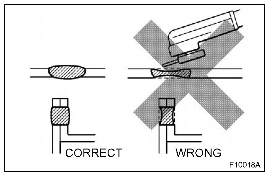 2. Plug welding should be done with a MIG (Metal Inert Gas) welder. Do not gas weld or braze panels at areas other than where specified.