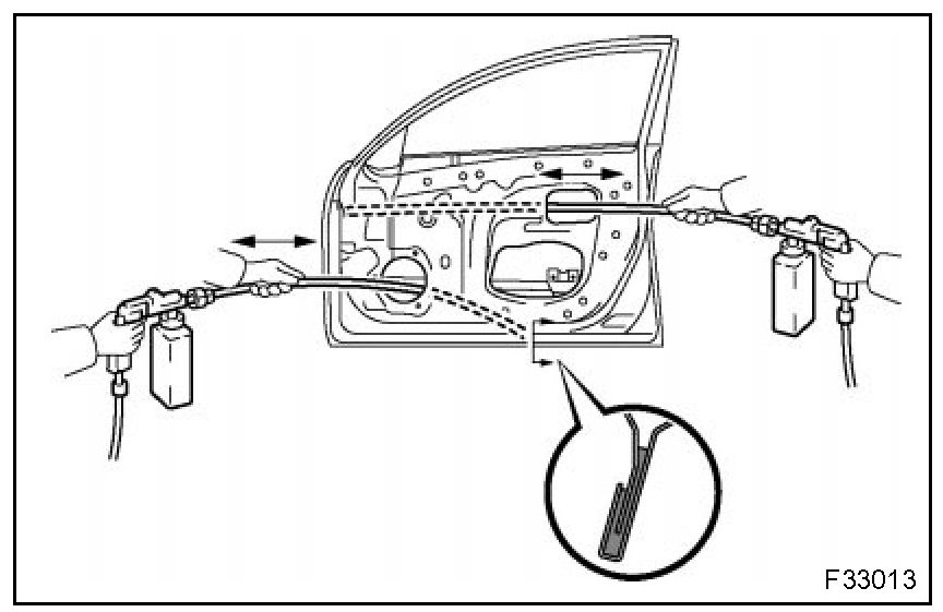 1. For water-proofing and anti-corrosion measures, always apply the body sealer to the body panel seams and hems of the doors, hood, etc.