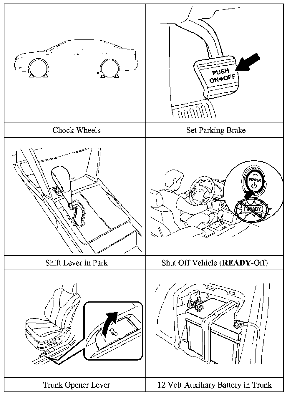 Performing either of the following procedures will shut the vehicle off and disable the HV battery pack, SRS, and gasoline fuel pump.