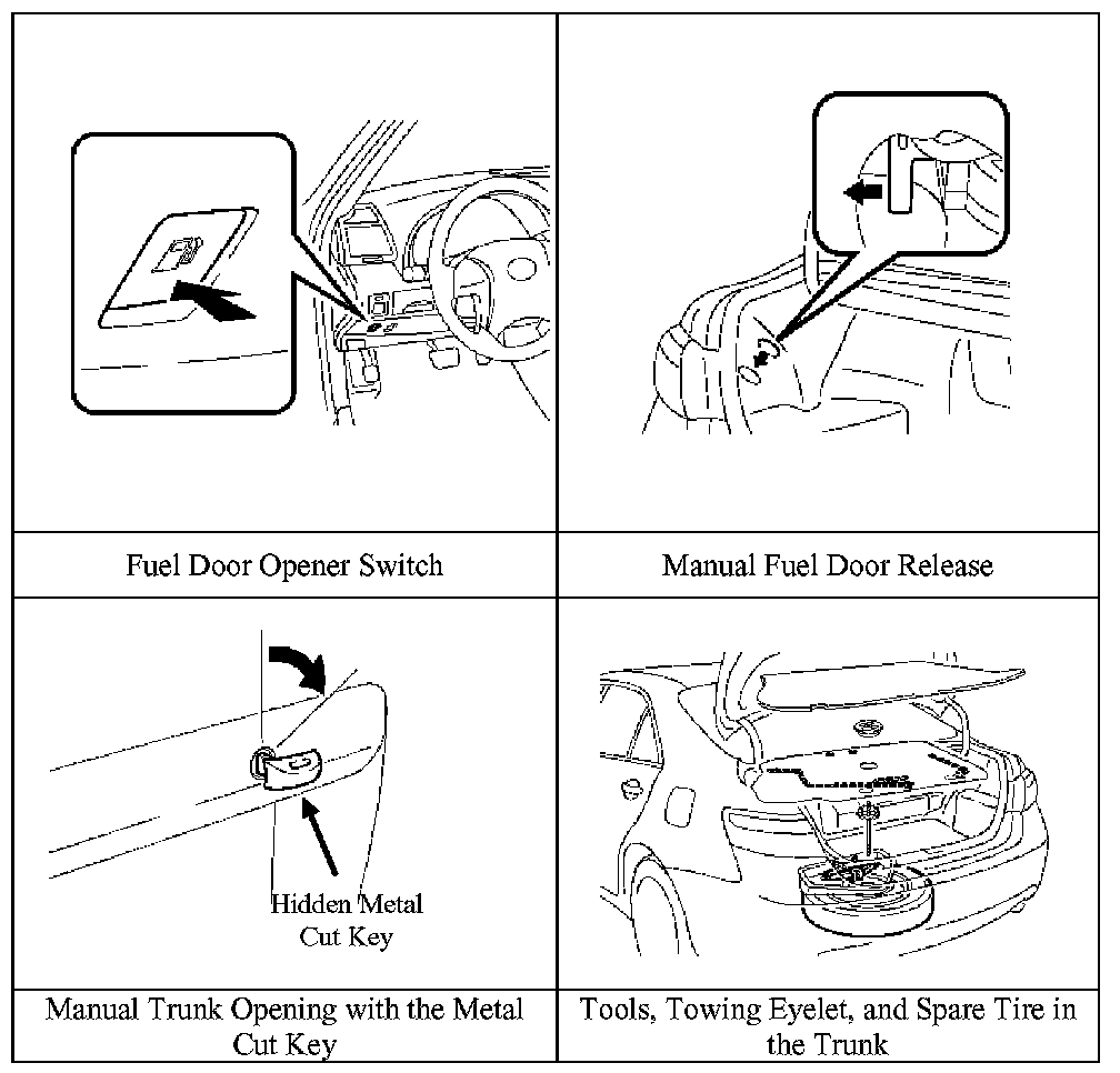 Before disconnecting the 12-Volt auxiliary battery, if necessary, reposition the power seats, lower the windows, unlock the doors, and open the fuel door as required. A manual fuel door release is located in the trunk (see illustration). Once the 12-Volt auxiliary battery is disconnected power controls will not operate.