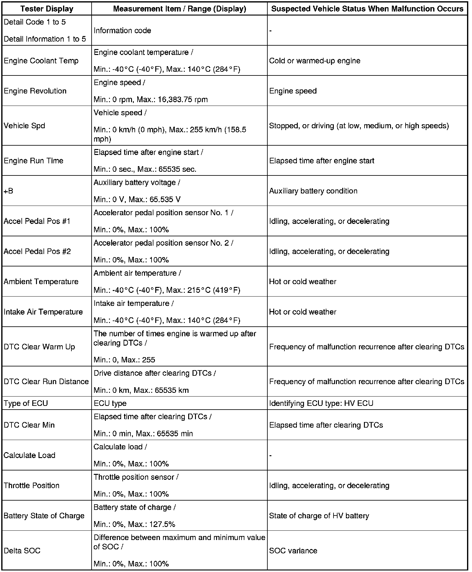 HINT: The hybrid vehicle control ECU records vehicle and driving condition information as freeze frame data the moment a DTC is stored. It can be used for estimating or duplicating the vehicle conditions that were present when the malfunction occurred. To confirm the details of the hybrid control system, check the detailed information for the DTC information code in the data list (INF code).