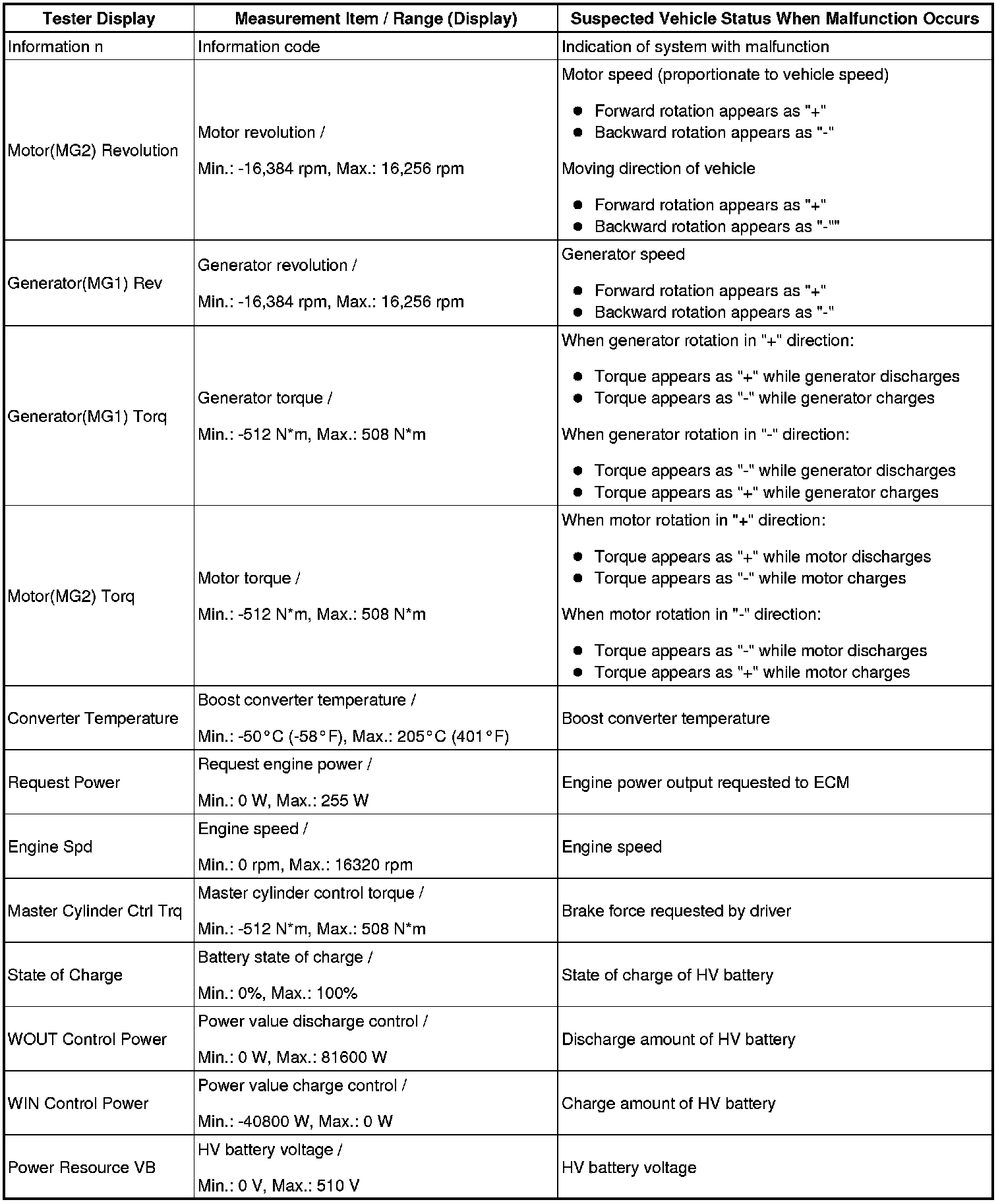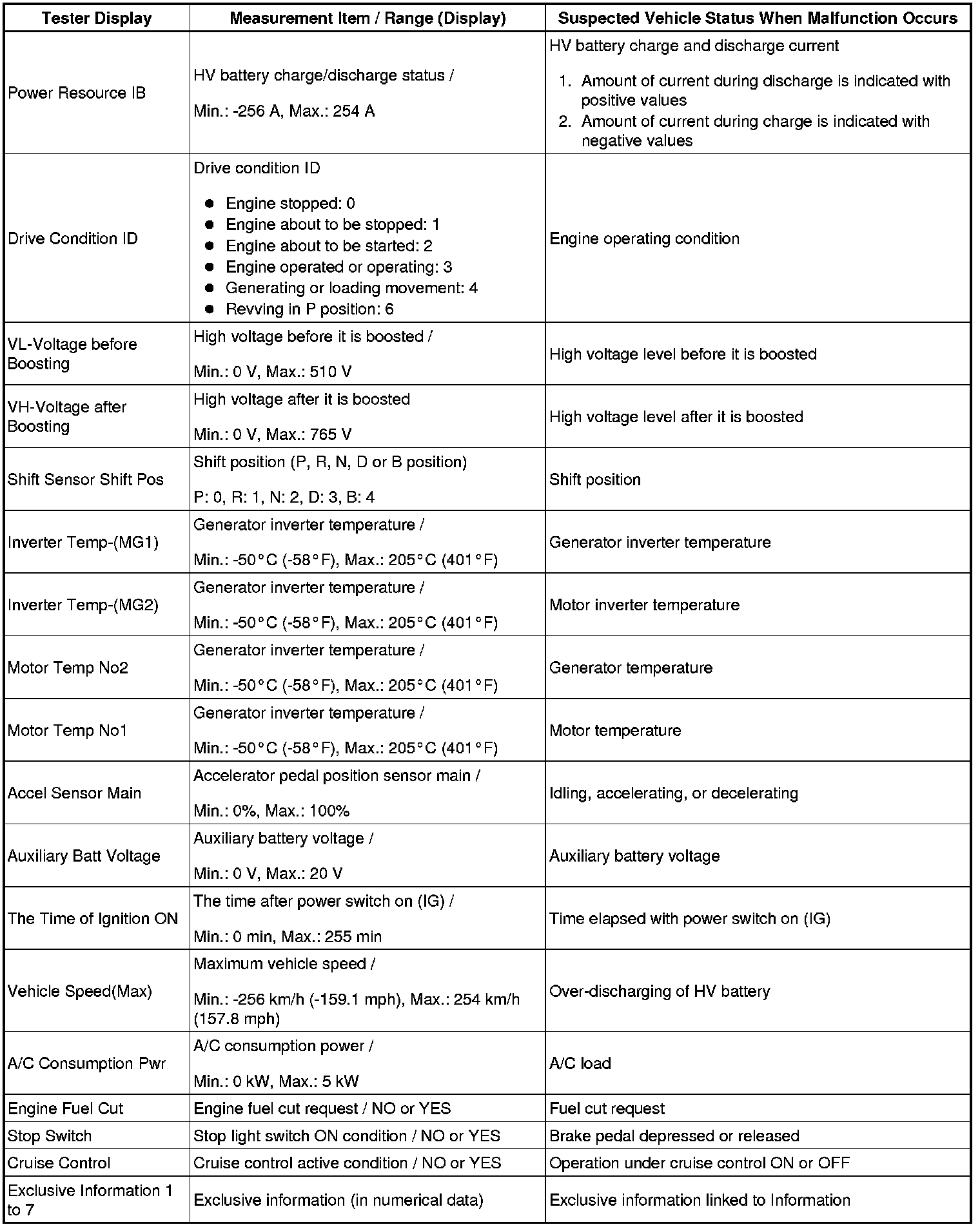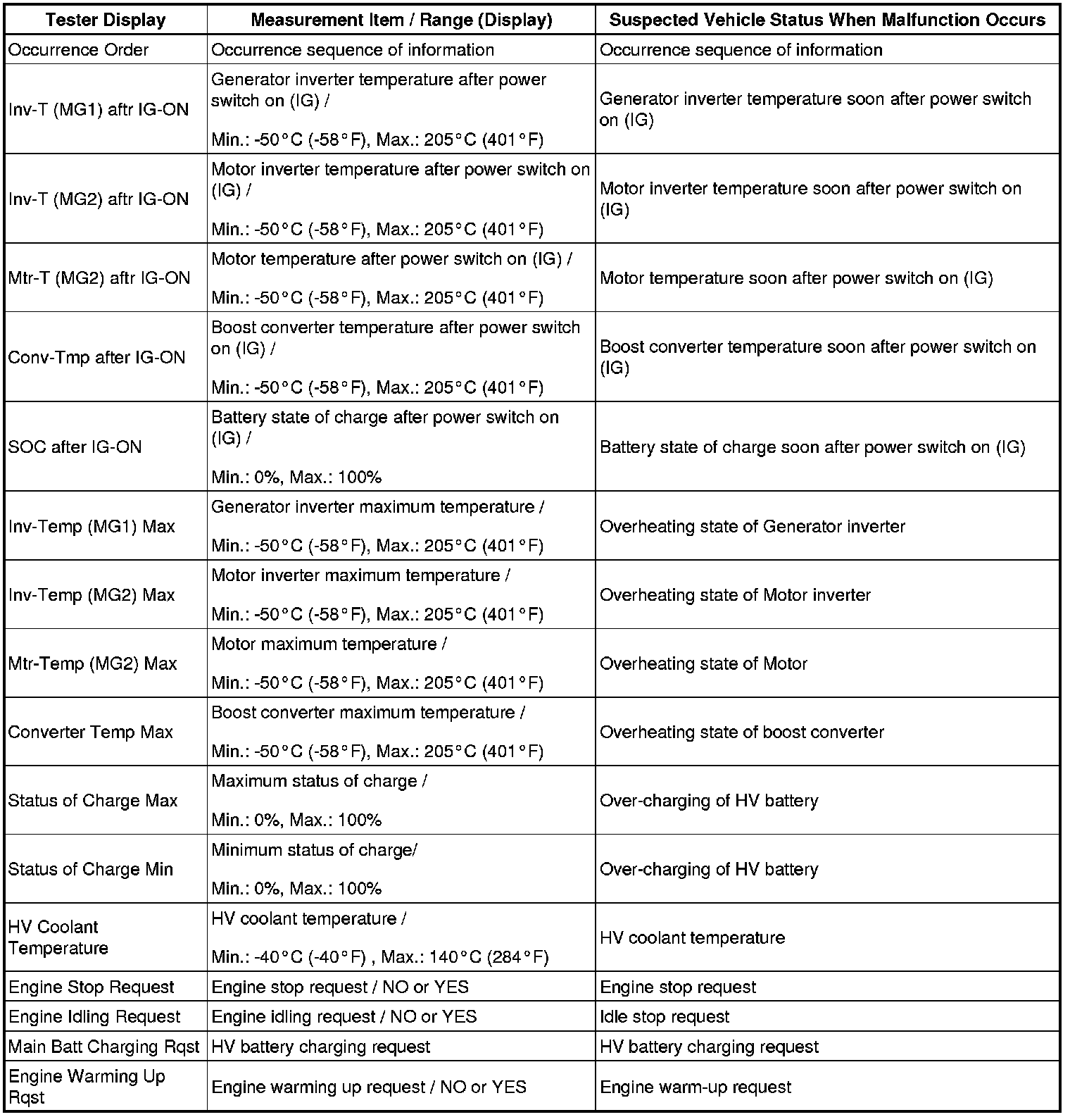HINT: Similar to freeze frame data, the hybrid vehicle control ECU also records vehicle and driving condition information as INFORMATION (INF code) at the moment a DTC is stored.