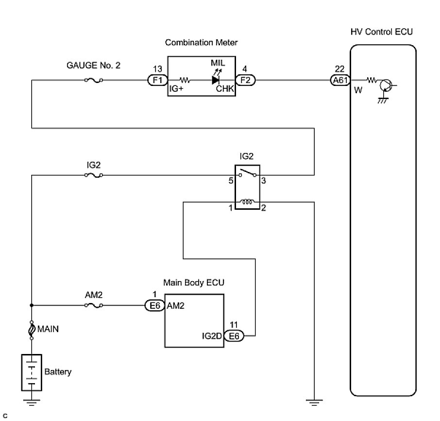 The MIL (Malfunction Indicator Lamp) is used to indicate vehicle malfunction detections by the ECM (included in hybrid vehicle control ECU). When the power switch on (IG), power is supplied to the MIL circuit, and the ECM provides the circuit ground which illuminates the MIL.