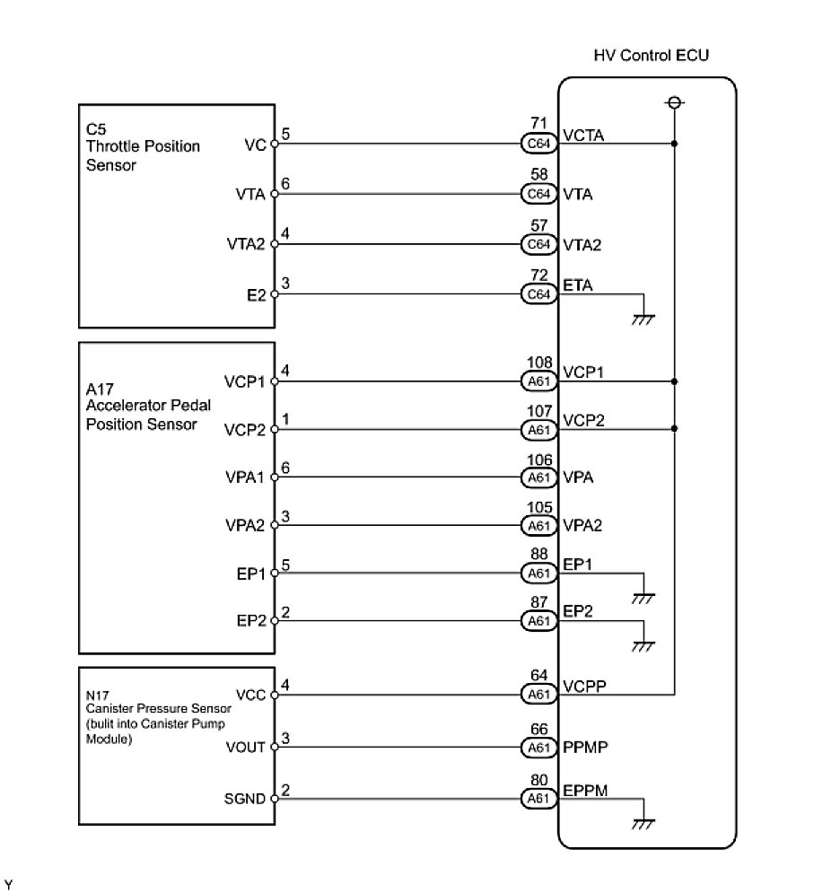 The ECM (Included in the hybrid vehicle control ECU) constantly generates 5 V power from the battery voltages supplied to the +B (BATT) terminal to operate the Micro-processor. The ECM also provides this power to the sensors through the VC output circuit.