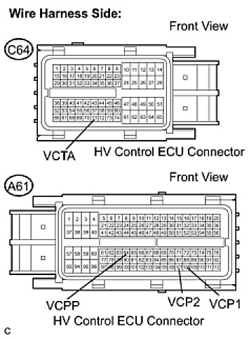 (e) Disconnect the A61 and C64 hybrid vehicle control ECU connectors.