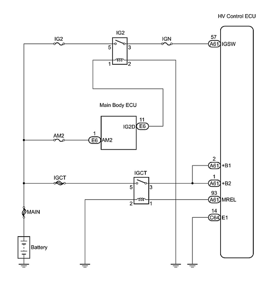 When the power switch is turned on (IG), voltage from the hybrid vehicle control ECU MREL terminal applies to the IGCT relay. This causes the contacts of the IGCT relay to close, which supplies power to terminal +B or +B1 of the hybrid vehicle control ECU.