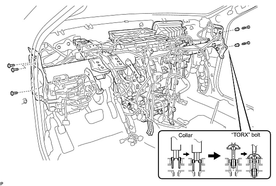 (2) Using a "TORX" socket wrench (T40), install the instrument panel reinforcement assembly with the 2 "TORX" bolts.
