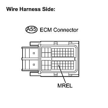 When the ignition switch is turned on (IG), the battery voltage is applied to terminal IGSW of the ECM. The ECM MREL output signal causes a current to flow to the coil, closing the contacts of the EFI MAIN relay and supplying power to terminal +B of the ECM.