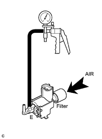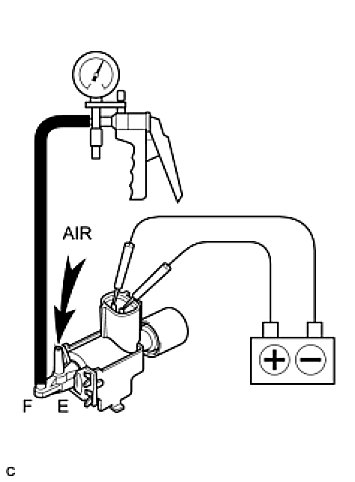(2) Apply battery voltage across the terminals. When vacuum is applied to the F port, check that air is sucked into the E port.