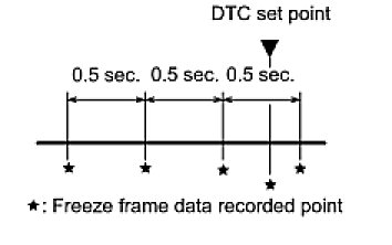 (b) The Techstream displays freeze frame data recorded at five different points: 1) 3 points before the DTC is set, 2) once when the DTC is set, and 3) once after the DTC is set. The data can be used to simulate the vehicle's condition around the time of the malfunction. The data may be helpful in determining the cause of a malfunction. It may also be helpful in determining whether a DTC is being caused by a temporary malfunction.