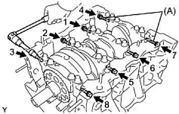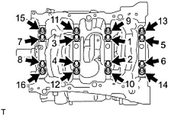 Install 8 new seal washers and uniformly tighten the 8 main bearing cap bolts in several steps and in the sequence shown in the illustration.