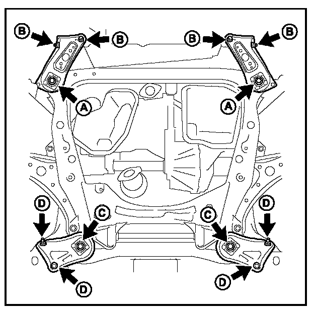 F. Install the front suspension member brace rear RH and LH with the 4 bolts and 2 nuts.