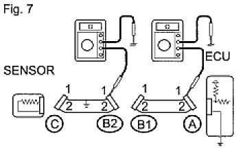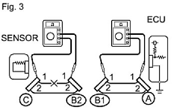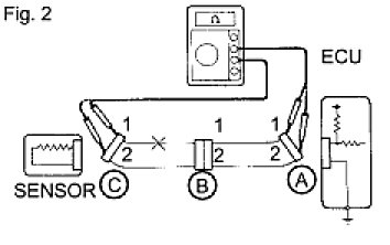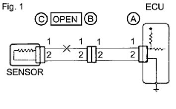 HINT: Measure the resistance while lightly shaking the wire harness vertically and horizontally. If the results match the examples above, an open circuit exists between terminal 1 of connector A and terminal 1 of connector C.