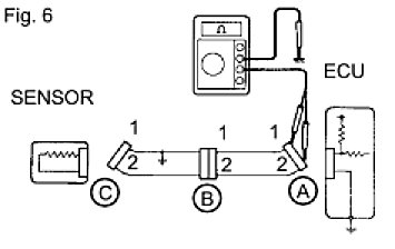 HINT: Measure the resistance while lightly shaking the wire harness vertically and horizontally. If your results match the examples above, an open circuit exists between terminal 1 of connector A and terminal 1 of connector C.