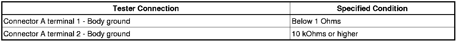 With each connector still connected, measure the voltage between the body ground and these terminals (in this order): 1) terminal 1 of connector A, 2) terminal 1 of connector B, and 3) terminal 1 of connector C.