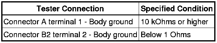 If the results match the examples above, a short circuit exists between terminal 1 of connector B2 and terminal 1 of connector C.