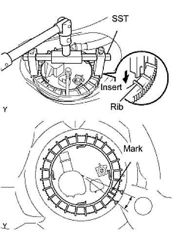 HINT: Insert the notch of SST into the rib of the fuel pump gauge retainer.