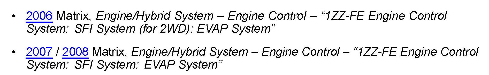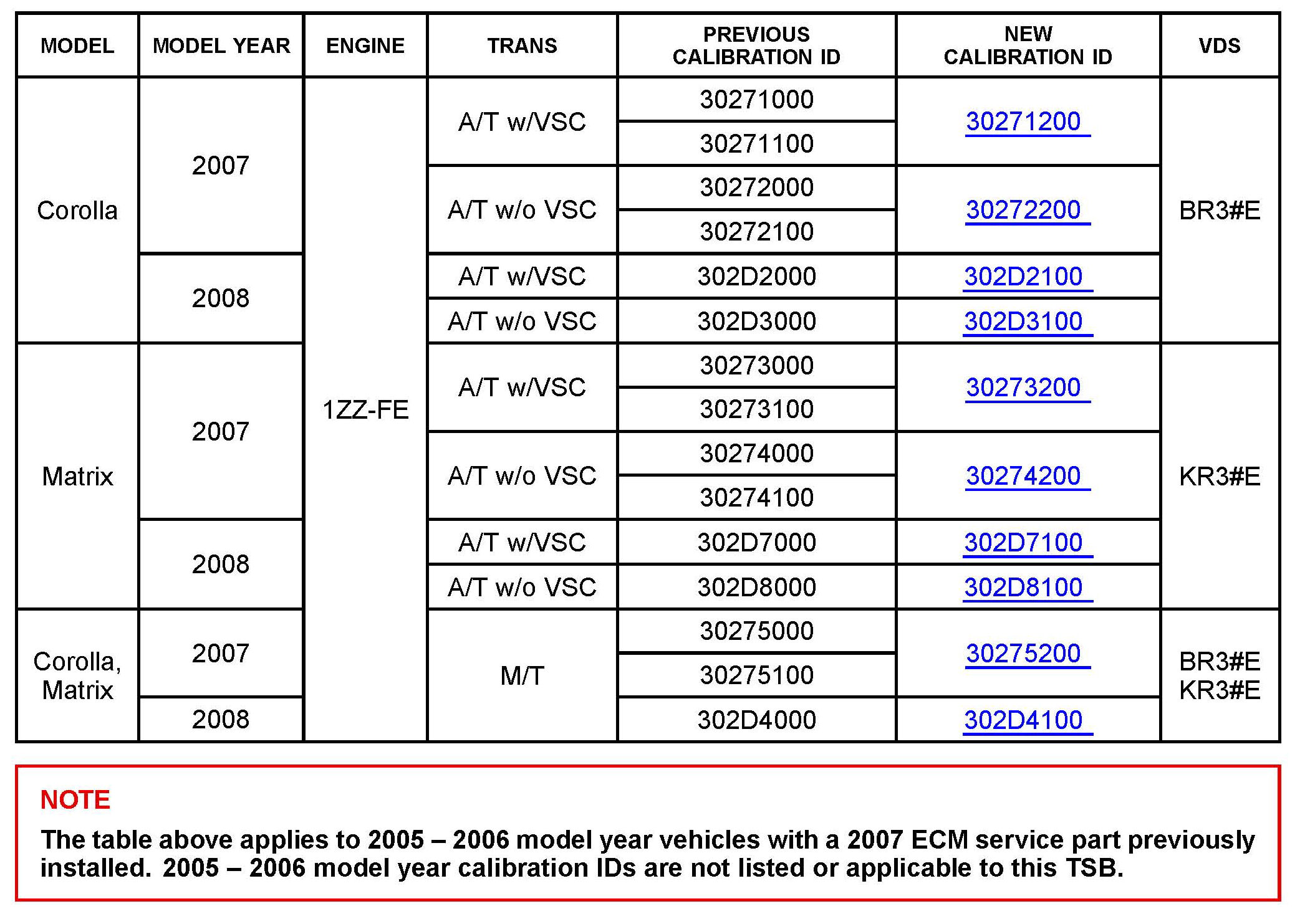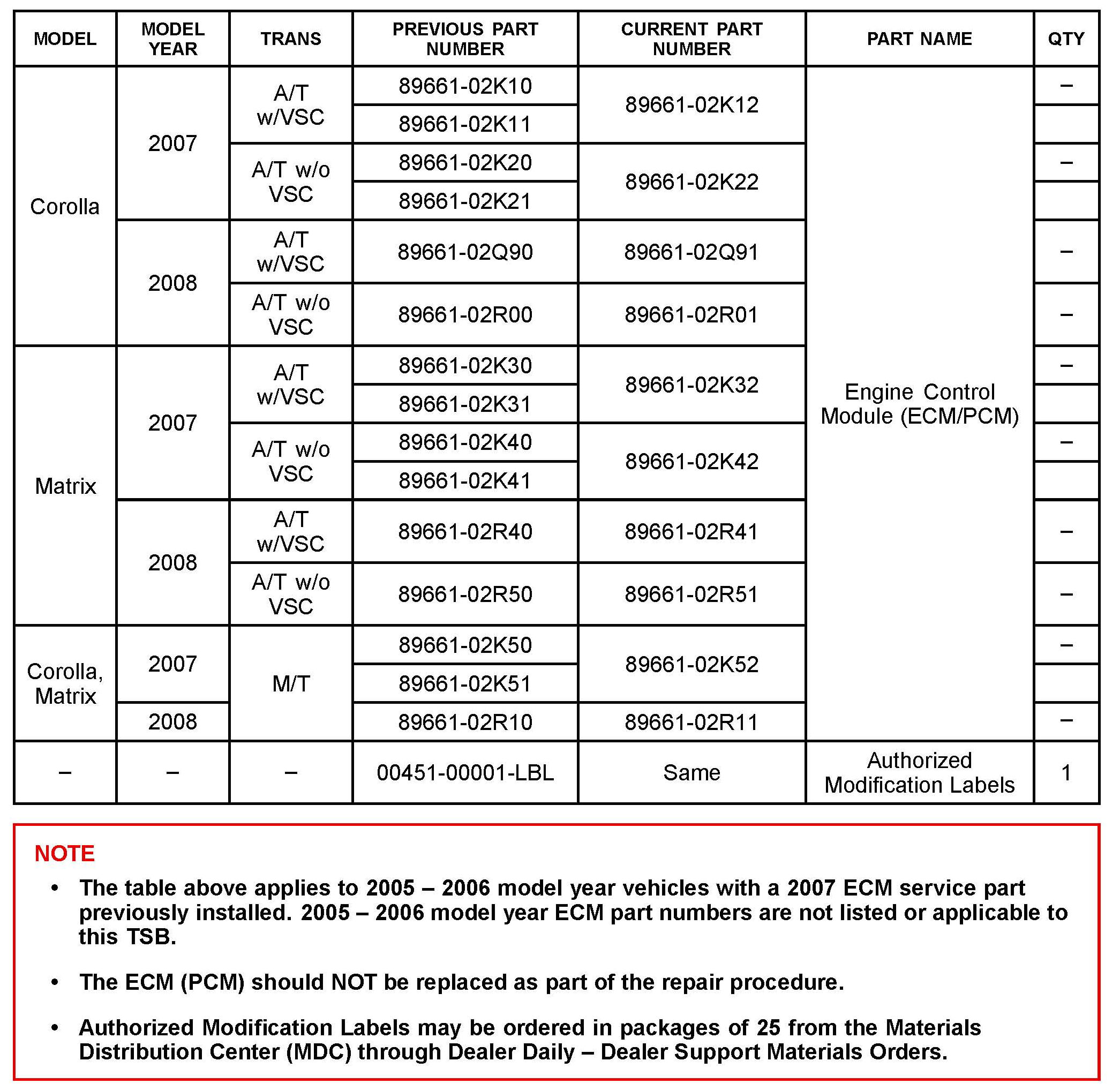 This TSB applies to 2005 - 2006 MY Corolla and Matrix vehicles that are currently equipped with a 2007 MY ECM.