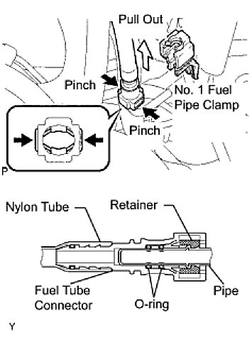 (e) Pinch the retainer of the fuel tube connector, then pull the fuel tube connector out of the pipe to disconnect the fuel tube.