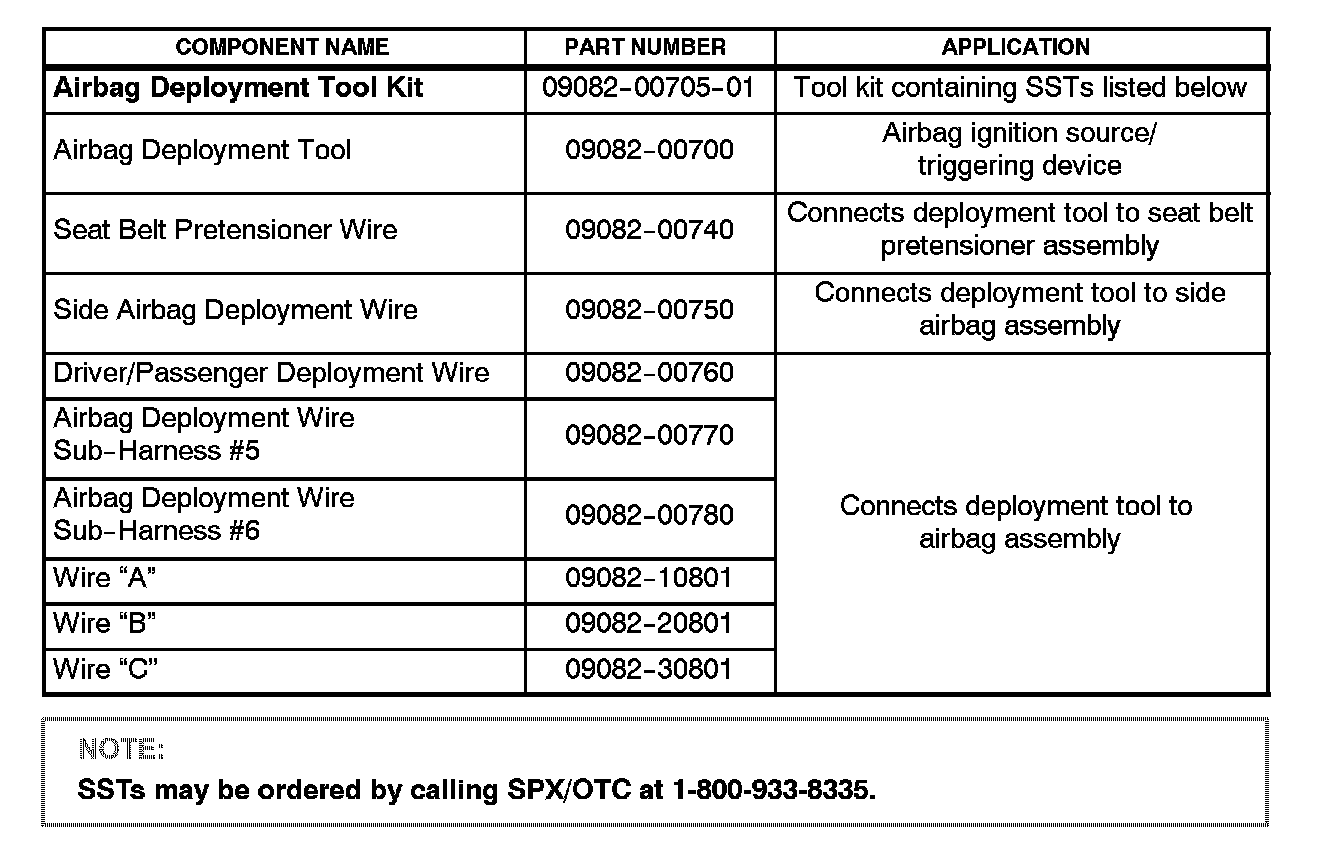 Special Service Tools (SSTs) for airbag and pre-tensioner deployment are no longer classified as essential SSTs. These tools will continue to be available through the SST program for dealerships choosing to continue airbag deployment in compliance with state and local governance. Refer to the following table for a list of current pre-disposal deployment SSTs and applications.