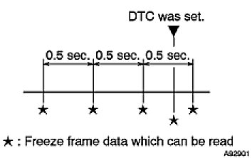 (h) Techstream records freeze frame data in five different instance: 1) 3 times before the DTC is set, 2) once when the DTC is set, and 3) once after the DTC is set. These data can be used to simulate the vehicle's condition around the time when the malfunction occurred. The data may help find the cause of the malfunction, or judge if the DTC is being caused by temporary malfunction or not.