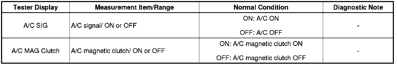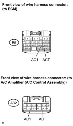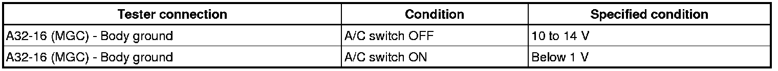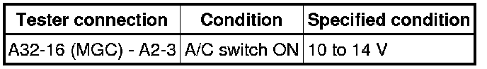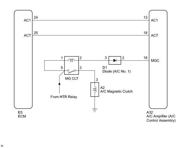 The A/C amplifier outputs the magnetic clutch ON signal from terminal AC1 to the ECM receives this signal, it sends a signal from terminal ACMG (MGC) and switches the magnetic clutch relay ON, thus turning on the magnetic clutch.