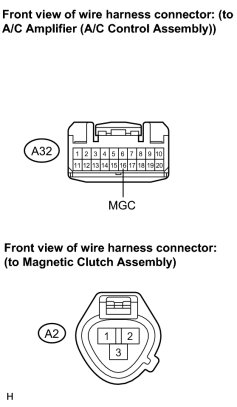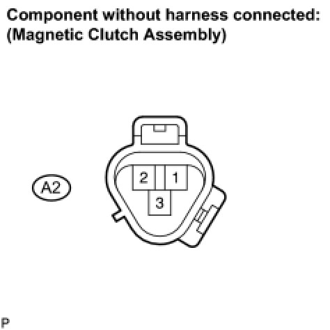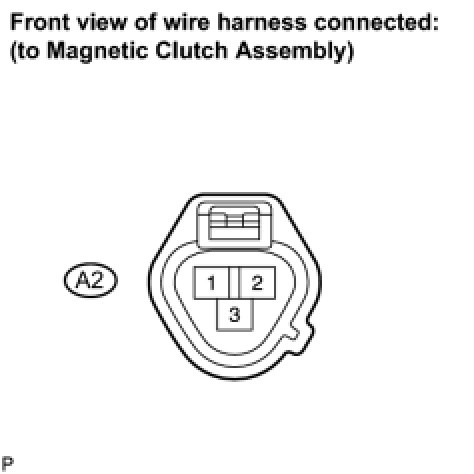 (b) Connect the positive (+) lead from the battery to terminal A2-3 and negative (-) lead to body ground, then check that the magnetic clutch assembly is engaged.