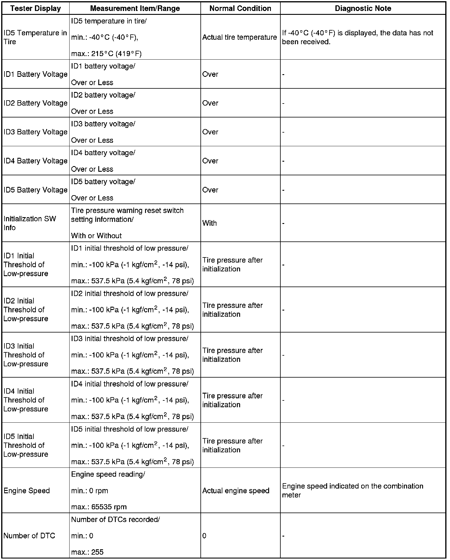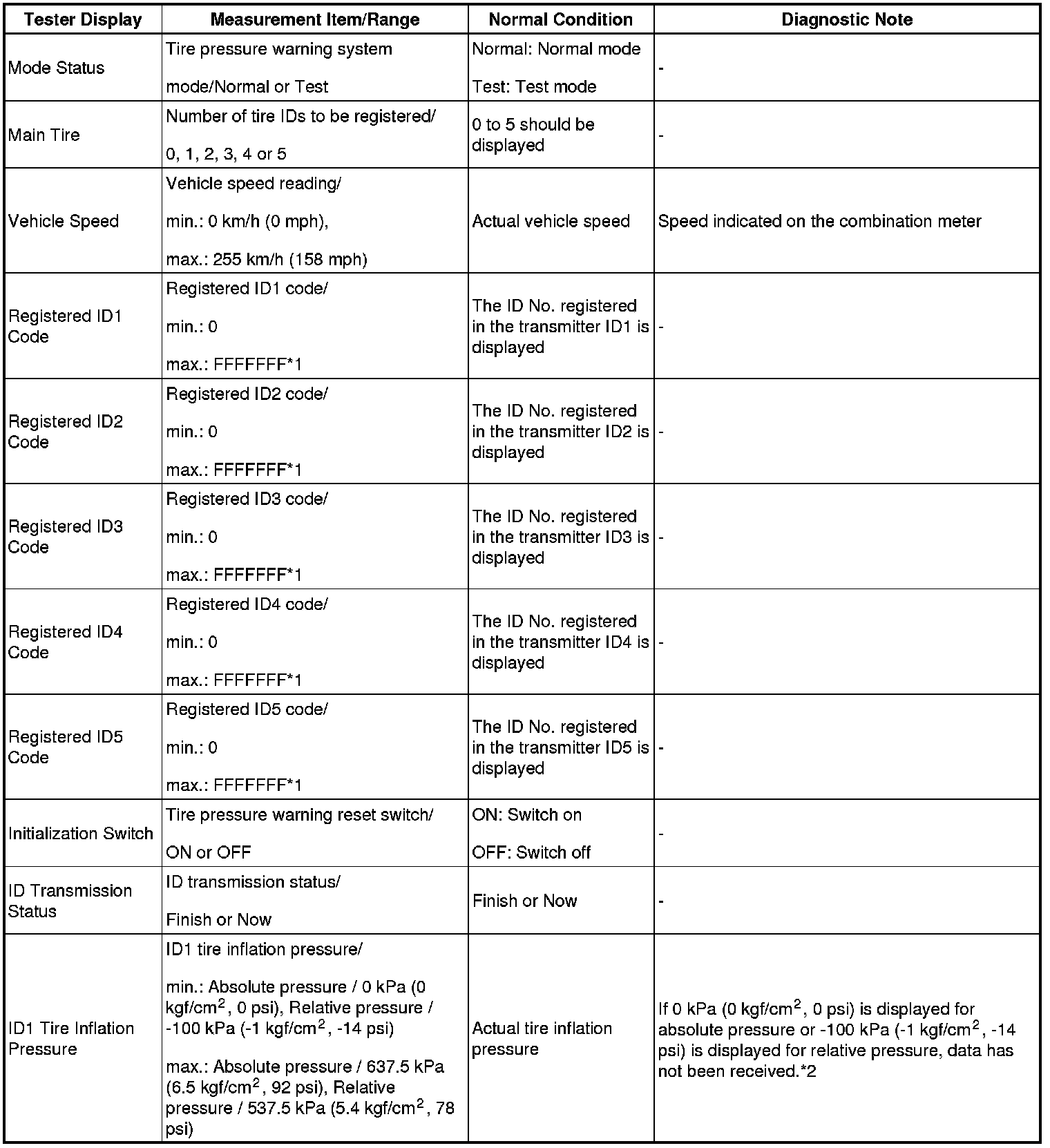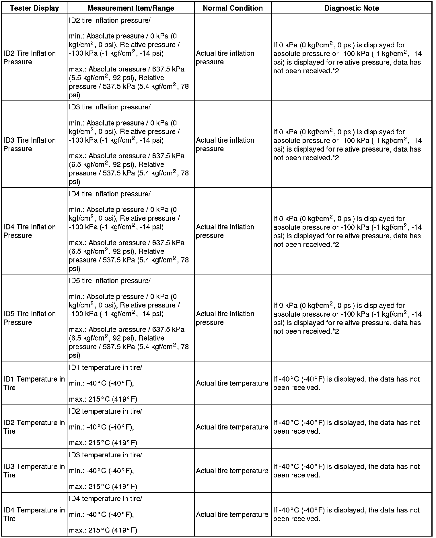 *2: It may take about 2 or 3 minutes until the values are displayed. If the values are not displayed after a few minutes, perform troubleshooting according to the inspection procedure for DTCs C2121/21 to C2125/25 (Tire Pressure Monitoring).